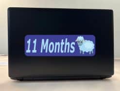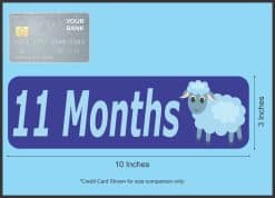 Celebrate the exciting first months of your baby’s life with this month marker sticker. This bumper sticker is 10 inches wide by 3 inches tall when applied and has the words, 11 Month in light blue letters on a dark blue background. The image of a blue lamb stands to the left of the text. If you have any special requests for 10 Month Stickers or any other type of decal or would like to purchase in higher quantities, please give us a shout.