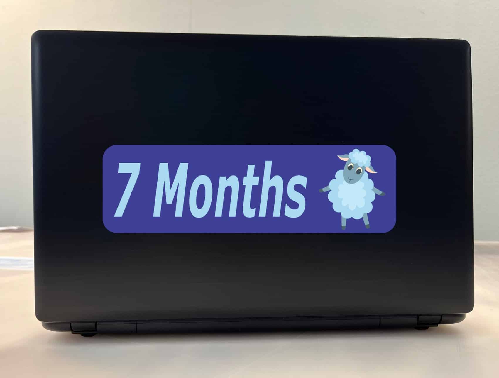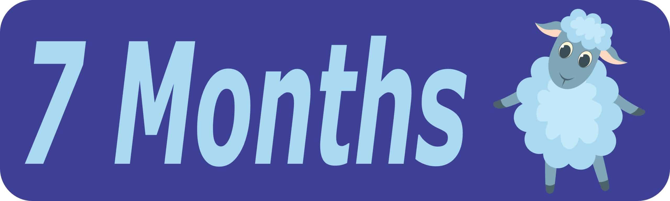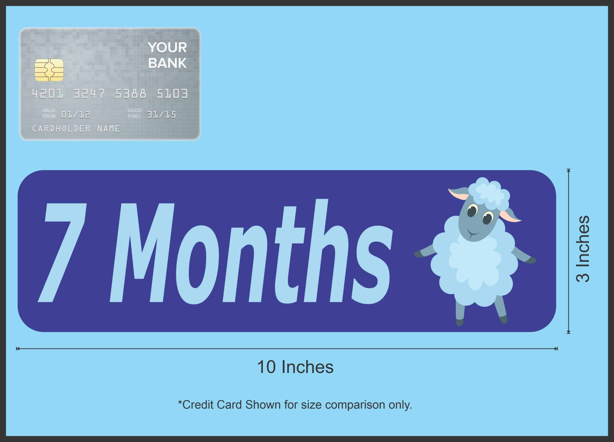 Celebrate the exciting first months of your baby’s life with this month marker sticker. This bumper sticker is 10 inches wide by 3 inches tall when applied and has the words, 7 Month in light blue letters on a dark blue background. The image of a blue lamb stands to the left of the text. If you have any special requests for 7 Month Stickers or any other type of decal or would like to purchase in higher quantities, please give us a shout.