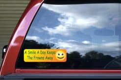 StickerTalk stickers are made to the highest standards. Your A Smile A Day Keeps The Frowns Away Bumper Sticker is made using only name brand materials. We start with solvent based inks that are scratch resistant, UV resistant and waterproof. We print that ink onto high quality vinyl that utilizes a special air release technology. This amazing tech incorporates micro channels into the adhesive of the sticker to allow you to smooth out most air bubbles after installation. So there isn’t a need to keep removing and reapplying until you get it right. However, if you do need to remove and reapply the sticker, because it isn’t straight or you just don’t like the location, this special adhesive allow for that too. We have tried many brands and many different product types and this is the best product available for bumper stickers. To make your new A Smile A Day Keeps The Frowns Away Bumper Sticker even better and to insure that it will last for years in most outdoor environments, we laminate every one with a PVC UV resistant film. This provides extra protection against UV rays and scratches and adds more life to your sticker. This step is one that most online sellers skip because it is time consuming and costly. However, at StickerTalk, your satisfaction is our primary concern. We won’t sell an A Smile A Day Keeps The Frowns Away Bumper Sticker unless we know it is the best we can make.