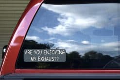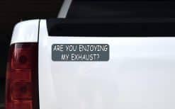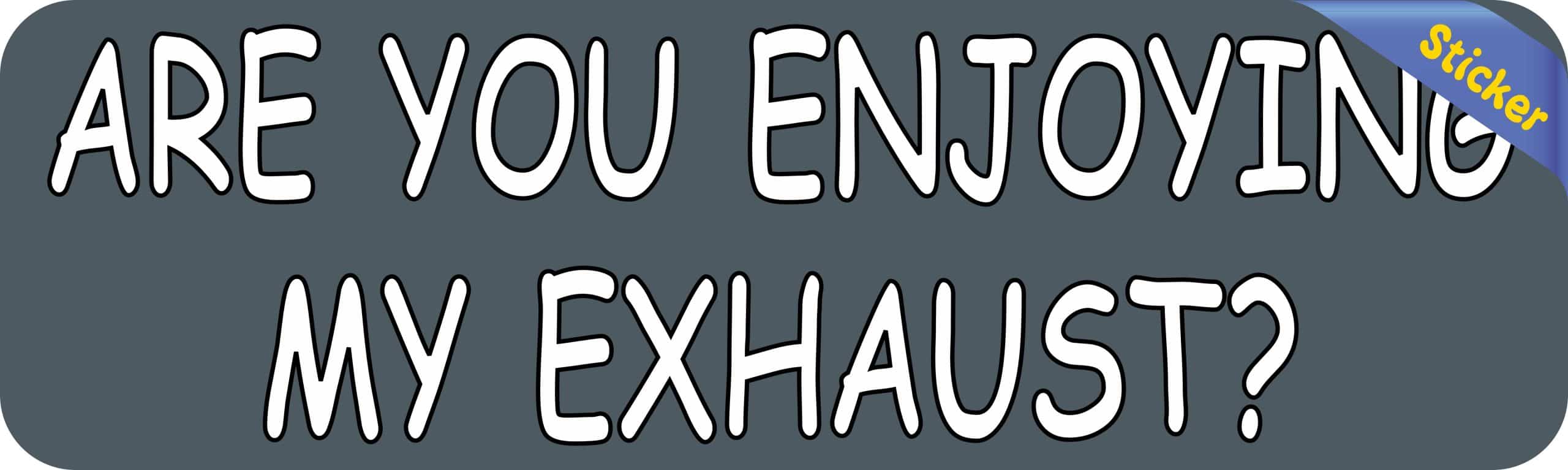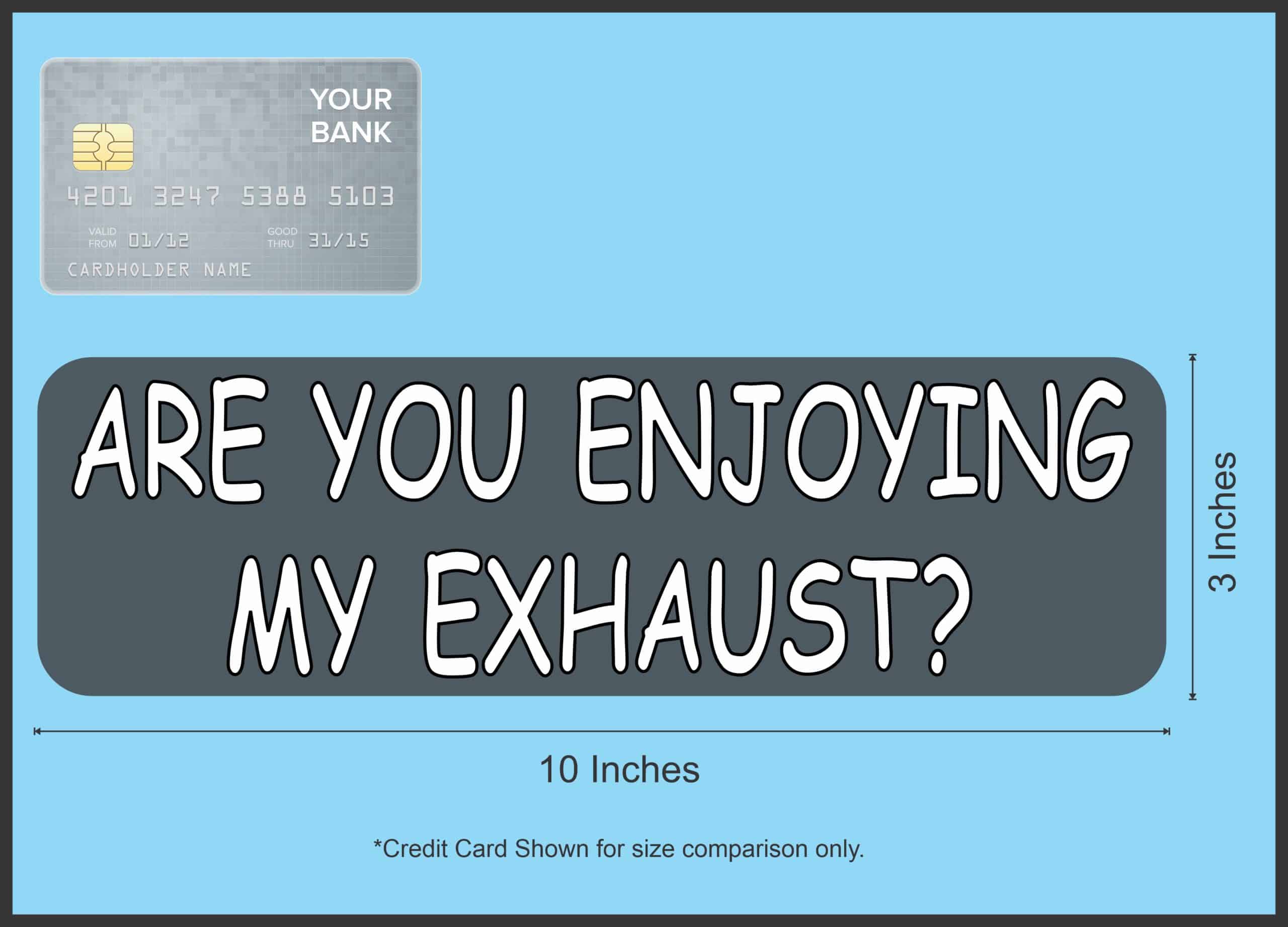 This bumper sticker is 10 inches wide by 3 inches tall when applied. It poses the question, ARE YOU ENJOYING MY EXHAUST, in white letters with black outlining on a gray background. This carefully crafted product is a witty way to add a bit of personality to your vehicle!
