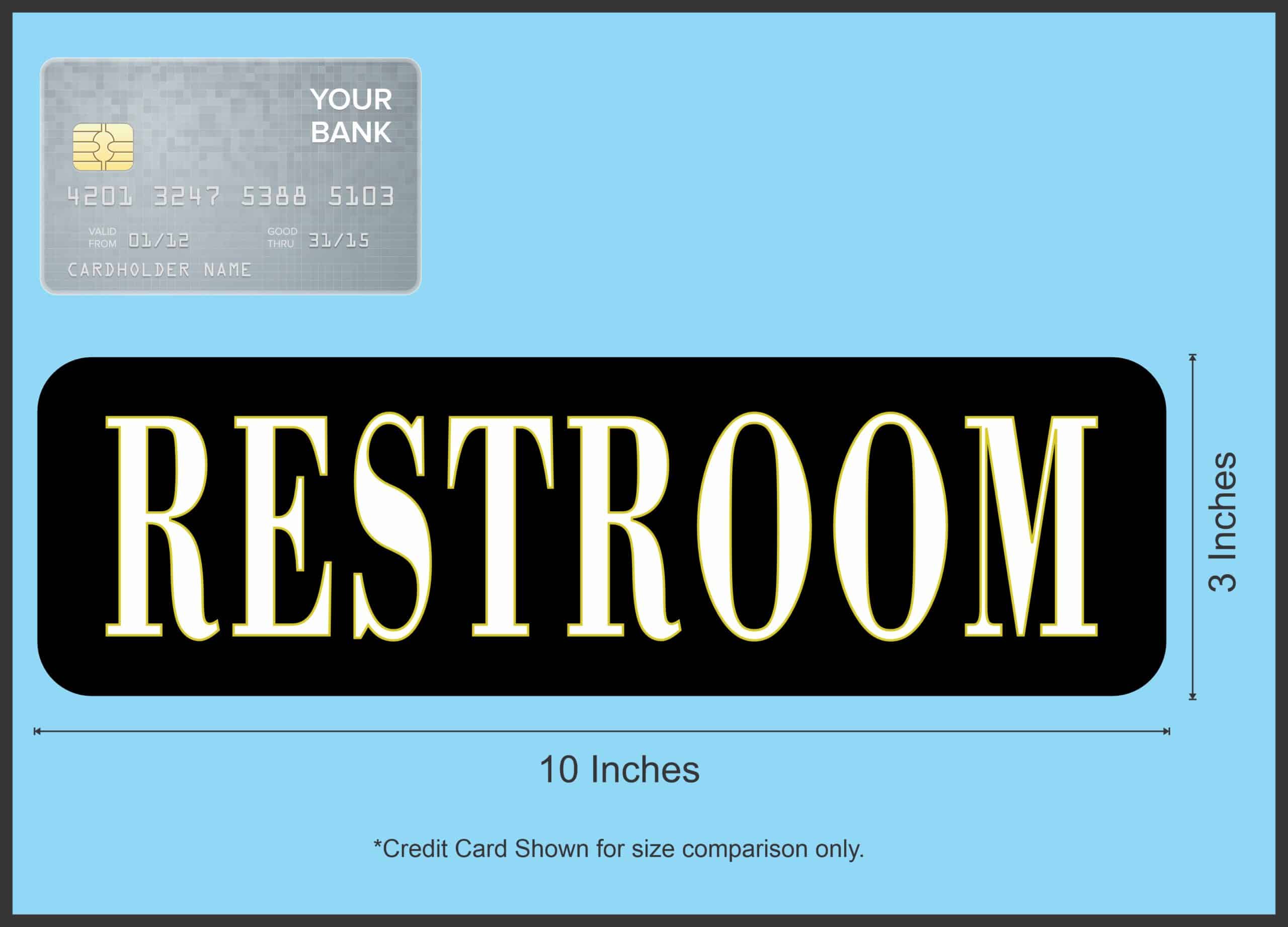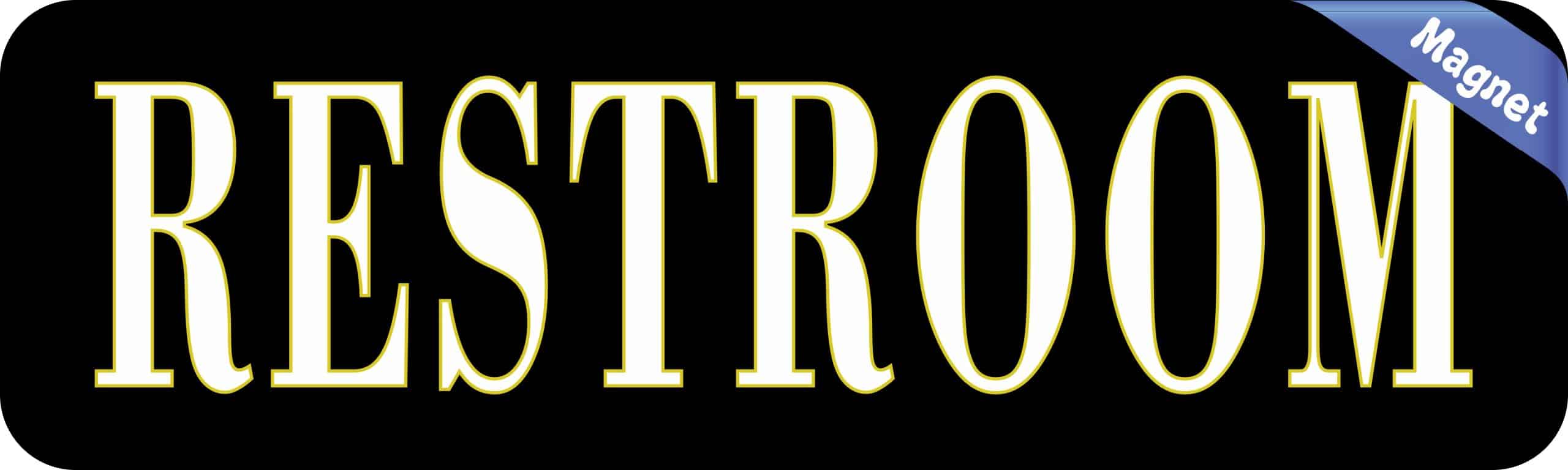 This bumper magnet is 10 inches wide by 3 inches tall when applied. It has the word, RESTROOM in white letters with green outlining on a black background. This carefully crafted product is ideal for display in the restrooms of churches, businesses, schools, and other public facilities. However, it only attracts ferromagnetic metals.