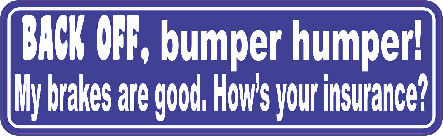 This magnet is 10 inches wide by 3 inches tall when applied. It reads the words, BACK OFF, bumper humper! My brakes are good. How’s your insurance?, in white letters on a blue background. A white border decorates the edges of the magnet. This carefully crafted product is a witty way to ward off pesky tailgaters! However, it only attracts ferromagnetic metals.