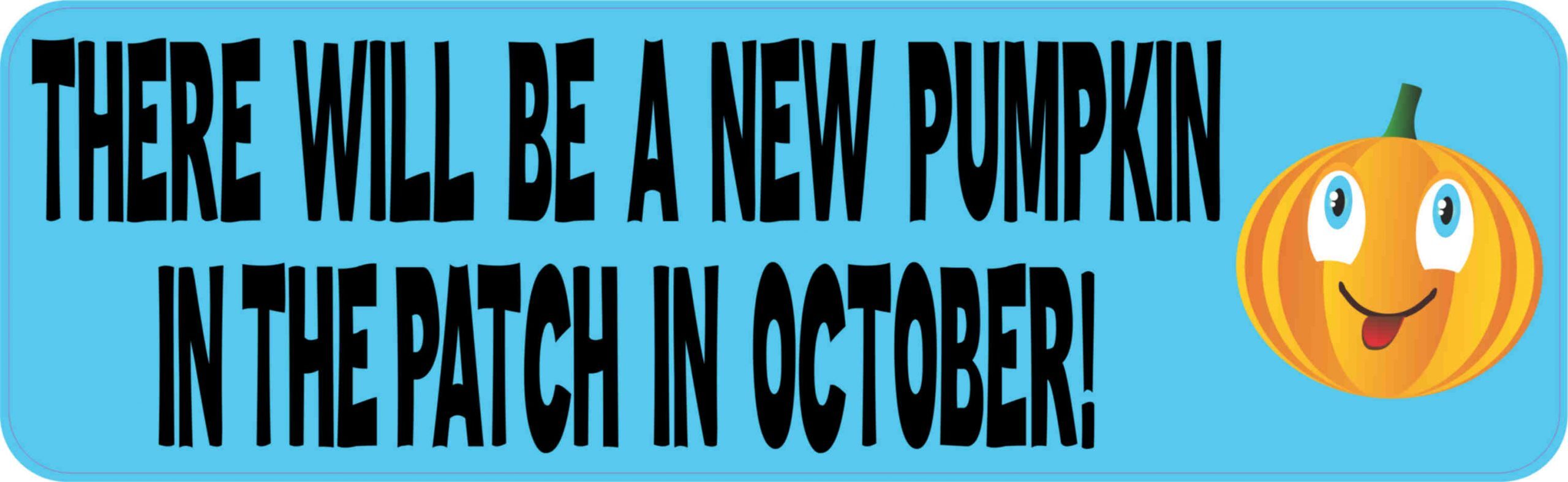 This bumper magnet is 10 inches wide by 3 inches tall when applied and has the words, THERE WILL BE A NEW PUMPKIN IN THE PATCH IN OCTOBER!, in black letters on a blue background. A smiling pumpkin appears in the bottom, right corner, putting the finishing touch on this adorable baby announcement magnet!