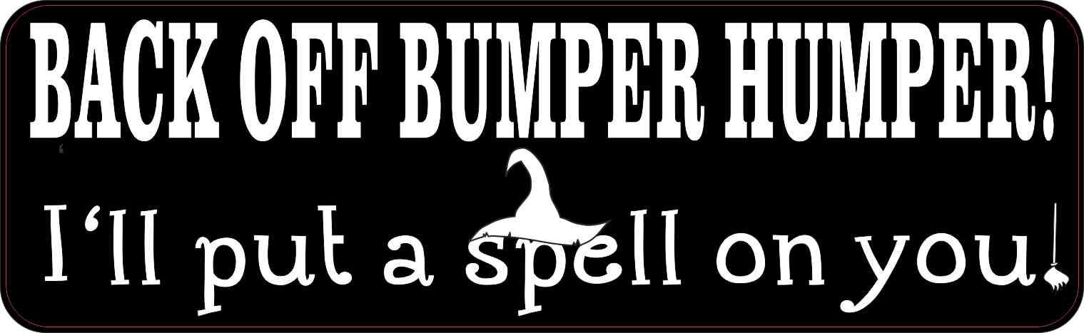 This bumper sticker is 10 inches wide by 3 inches tall when applied.  It features the words, BACK OFF BUMPER HUMPER! I’ll put a spell on you, in white letters on a black background. A white silhouette of a witch’s hat is printed on top of the word, spell, and a white silhouette of a broomstick is printed following the word, you.  This quality-made product is a wicked way to ward off those pesky tailgaters!