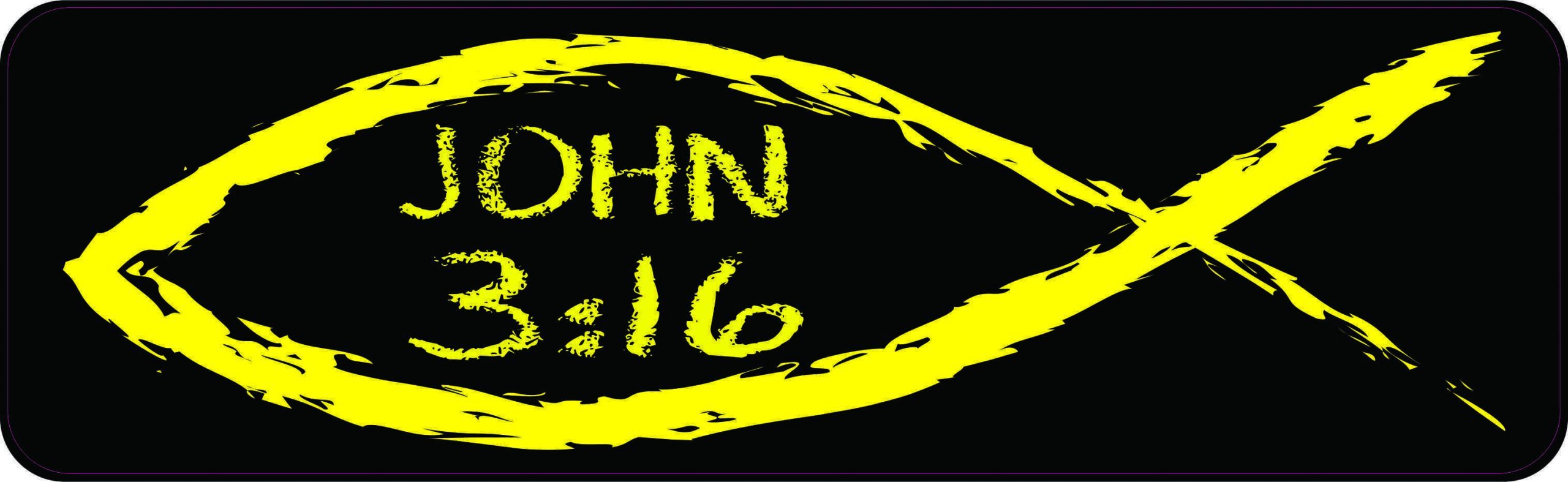 This bumper sticker is 10 inches wide by 3 inches tall when applied. It depicts a yellow Christian fish on a black background; the verse location, JOHN 3:16, is printed inside the fish in yellow characters. This carefully crafted product is a great way to share your faith!
