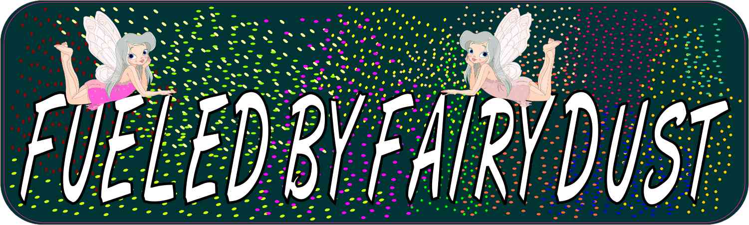 This magnet is 10 inches wide by 3 inches tall when applied.  It features the phrase, FUELED BY FAIRY DUST, in white letters with black outlining on a forest green background.  Multicolored sprinkles of fairy dust decorate the background, and a pair of brightly-colored fairies lounge on top of the text.  This quality-made product is a fantastic way to add a bit of personality to your vehicle!  However, it only attracts ferromagnetic metals.