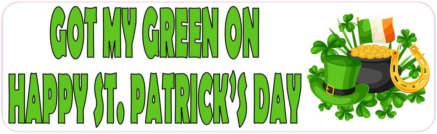 This bumper magnet is 10 inches wide by 3 inches tall when applied and has the words, GOT MY GREEN ON, on the top line of text, and the phrase, HAPPY ST. PATRICK’S DAY, underneath. All words are printed in green letters, outlined in black, on a white background. A group of Irish symbols, a green leprechaun’s hat, a pot of gold, a golden horseshoe, an Irish flag, and a patch of shamrocks, appears to the right of the text. The pink line in the image shows where the magnet is cut. Our Got My Green On Magnet is a great addition to any St. Patrick’s Day celebration! However, it only attracts ferromagnetic materials.