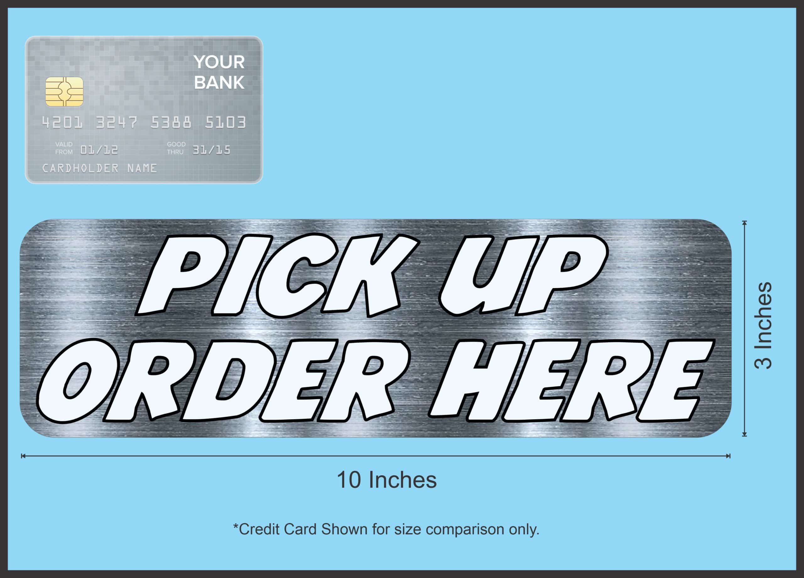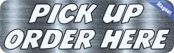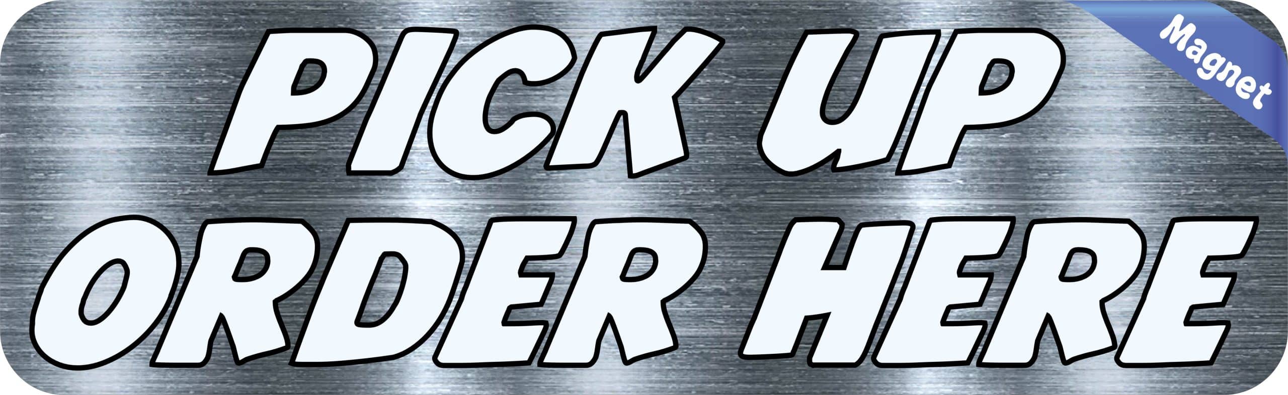 This bumper magnet is 10 inches wide by 3 inches tall when applied and has the words, PICK UP ORDER HERE, in gray letters, outlined in black, on a simulated metal background. If you have any special requests for Gray Pick Up Order Here magnets or any other type of decal, please do not hesitate to contact us.
