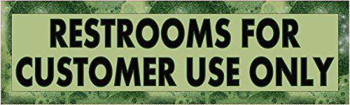 This sticker is 10 inches wide by 3 inches tall when applied. The words, RESTROOMS FOR CUSTOMER USE ONLY, are printed in black letters with dark green outlining on a green background. The sticker’s border is decorated with a unique, green and white pattern. This quality-made product is durable and easily visible, making it a great addition to nearly any place of business.