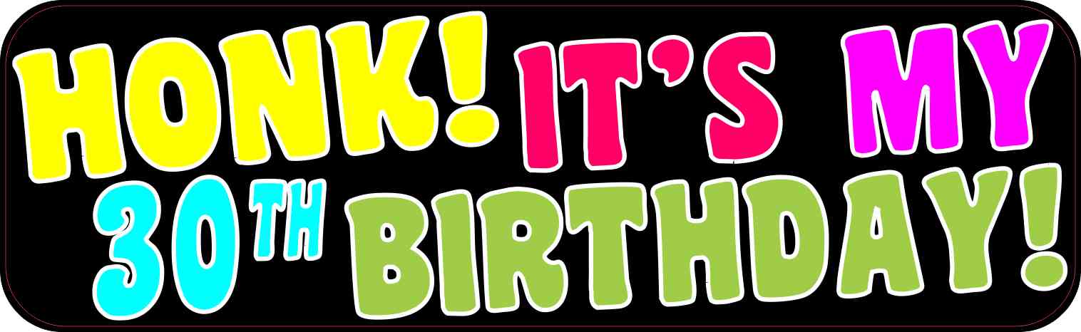 This bumper sticker is 10 inches wide by 3 inches tall when applied and has the words, HONK! IT’S MY 30th BIRTHDAY!, in yellow, coral, purple, green, and teal letters, all outlined in white, on a black background. This sticker is sure to garner smiles!