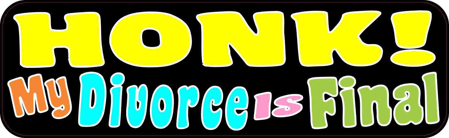 This bumper sticker is 10 inches wide by 3 inches tall when applied. It features the phrase, Honk! My Divorce Is Final, in neon yellow, orange, teal, pink, and green letters, all outlined in white, on a black background. Our Honk! My Divorce Is Final Bumper Sticker is sure to garner smiles and honks!