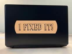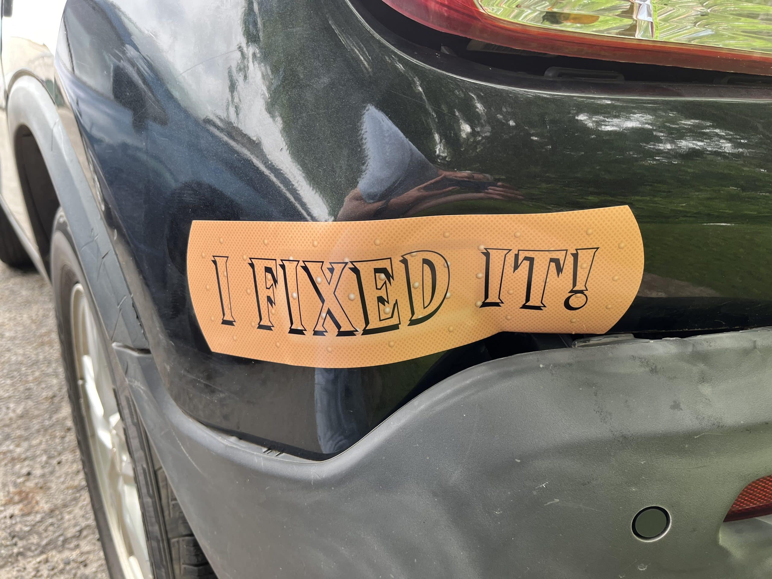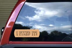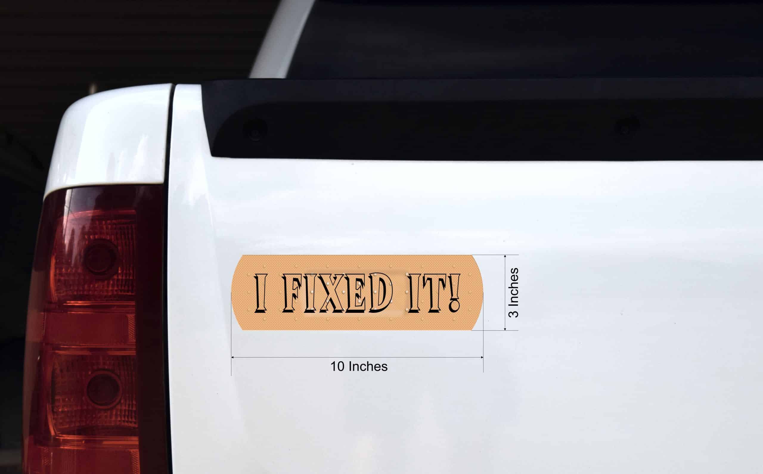 This sticker is 10 inches wide by 3 inches tall. The background is designed to resemble a tan adhesive bandage. The words, I FIXED IT!, are printed in the foreground in black shadow letters. This quality-made product makes dents and dings in your vehicle a little more bearable!