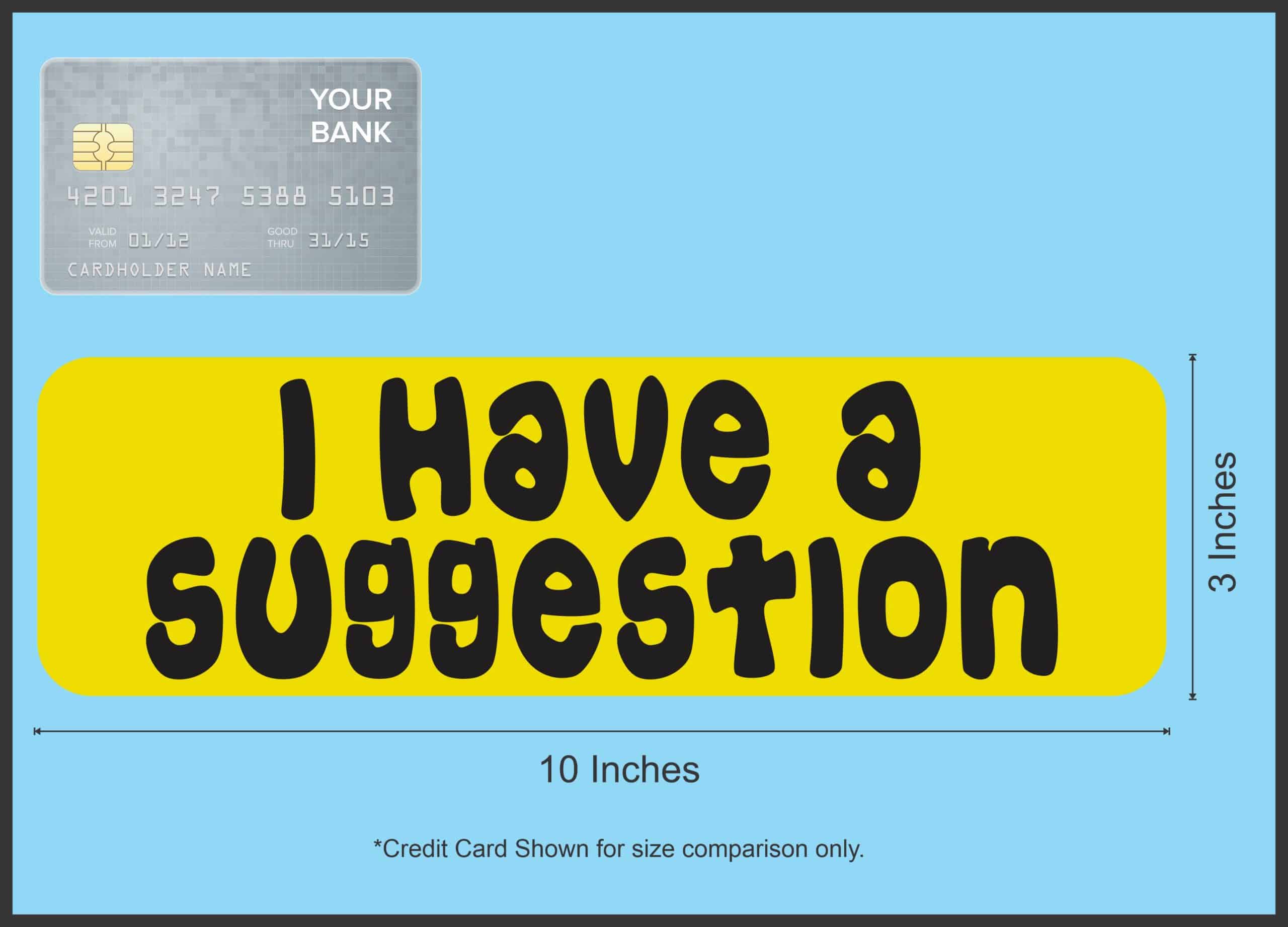 This bumper magnet is 10 inches wide by 3 inches tall when applied. It features the phrase, I Have a Suggestion, in black letters on a yellow background. This quality-made product is a great way add a bit of personality to your vehicle or almost any other hard, flat surface. However, it only attracts ferromagnetic metals.