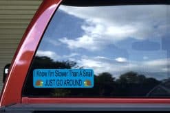 This bumper sticker is 10 inches wide by 3 inches tall when applied.  It features the words, I Know I’m Slower Than A Snail JUST GO AROUND, in black letters on a blue background.  Mirrored images of a green snail with a brown shell is printed in the bottom corners of the sticker.  This carefully crafted product is a witty way to add a bit of personality to your vehicle!