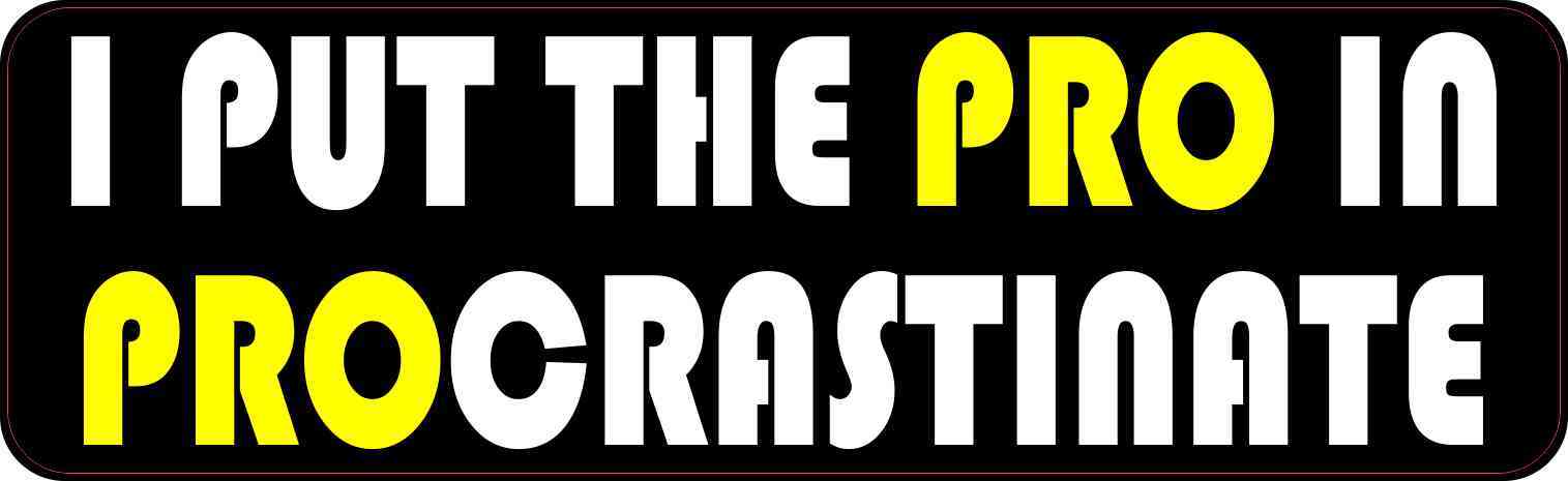 This bumper sticker is 10 inches wide by 3 inches tall when applied.  It features the phrase, I PUT THE PRO IN PROCRASTINATE.  The word, PRO, and the PRO of PROCRASTINATE are printed in neon yellow letters.  The remainder of the text is white, and the sticker’s background is black.  This quality-made product is a witty way to add a bit of personality to your vehicle!