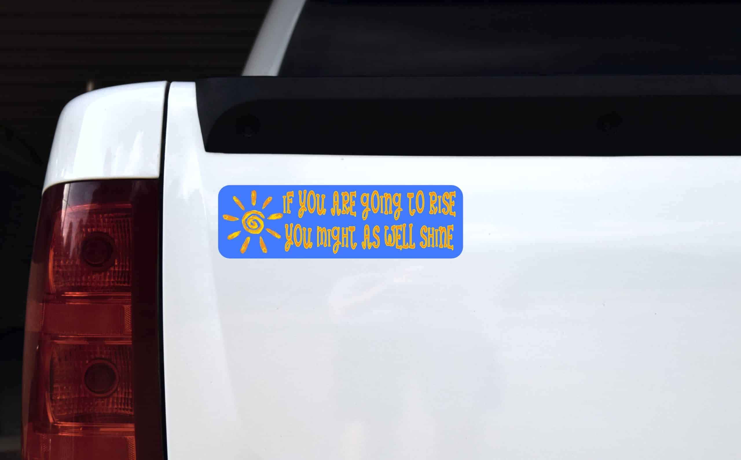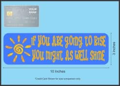 This magnet is 10 inches wide by 3 inches tall when applied. It features the phrase, IF YOU ARE GOING TO RISE YOU MIGHT AS WELL SHINE, in orange letters with yellow outlining on a blue background. An orange and yellow sun is printed on the left side of the magnet. This carefully crafted product is a great way to encourage yourself and those around you! However, it only attracts ferromagnetic metals.