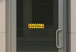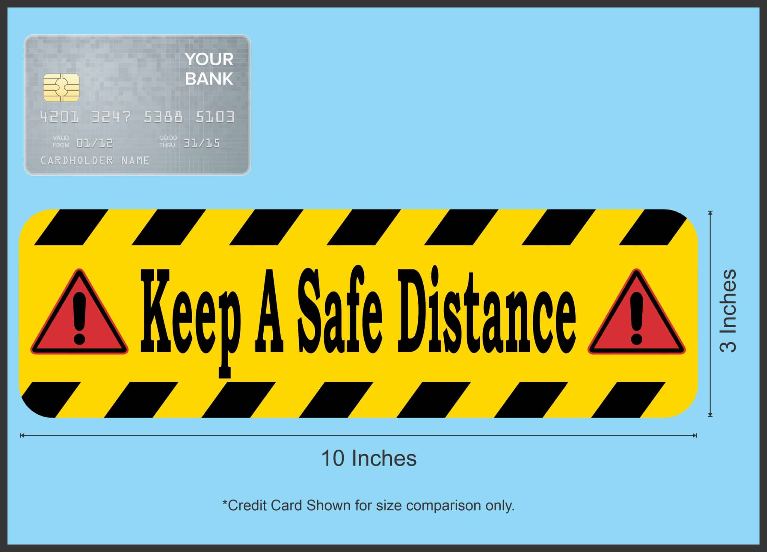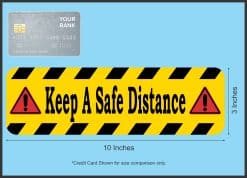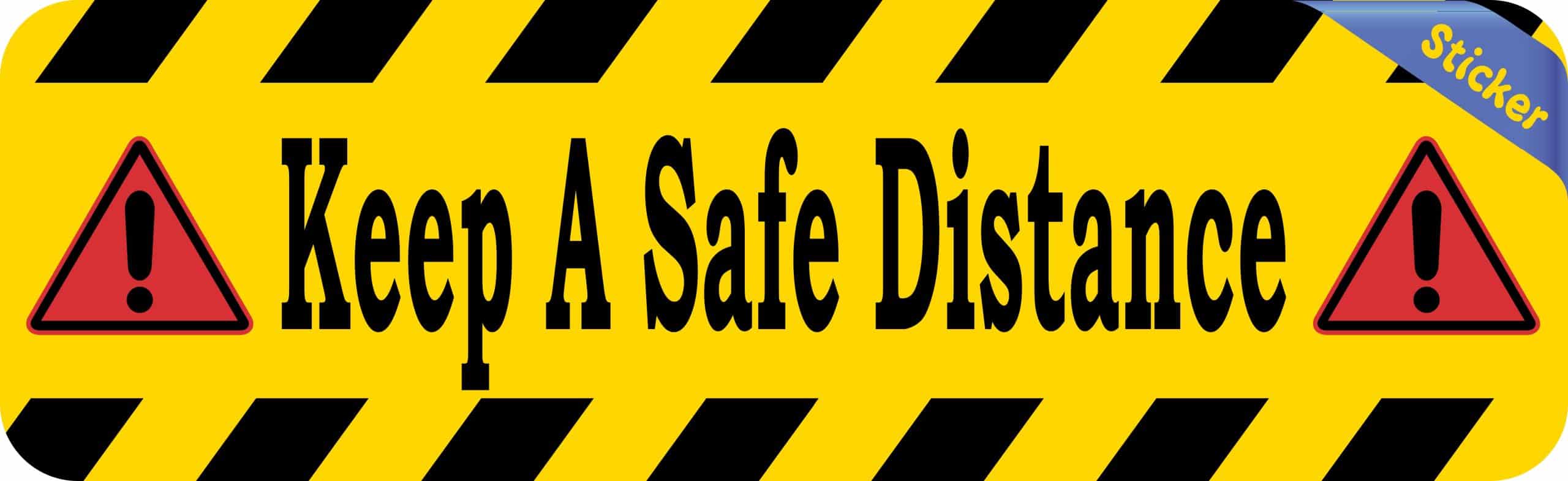 This sticker is 10 inches wide by 3 inches tall when applied and has the words, Keep A Safe Distance, in black letters on a yellow background. The top and bottom borders of the sticker are accented by yellow and black diagonal stripes. On each side of the text a red caution triangle with a black exclamation point is printed as well. This product makes a great addition to nearly any place of business!