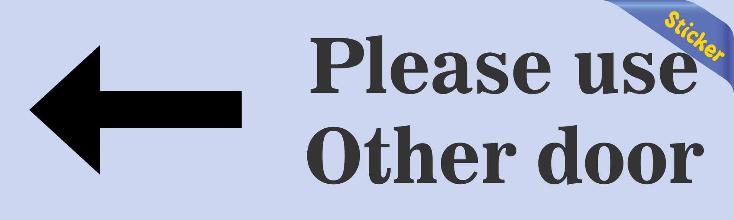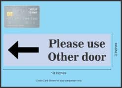 This sticker is 10 inches wide by 3 inches tall when applied.  The words, Please use Other door, are printed on the sticker’s periwinkle background in black letters.  A black, left-pointing arrow is printed on the left side of the sticker.  This quality-made product is durable and easily visible, making it ideal for display in a variety of settings and scenarios.
