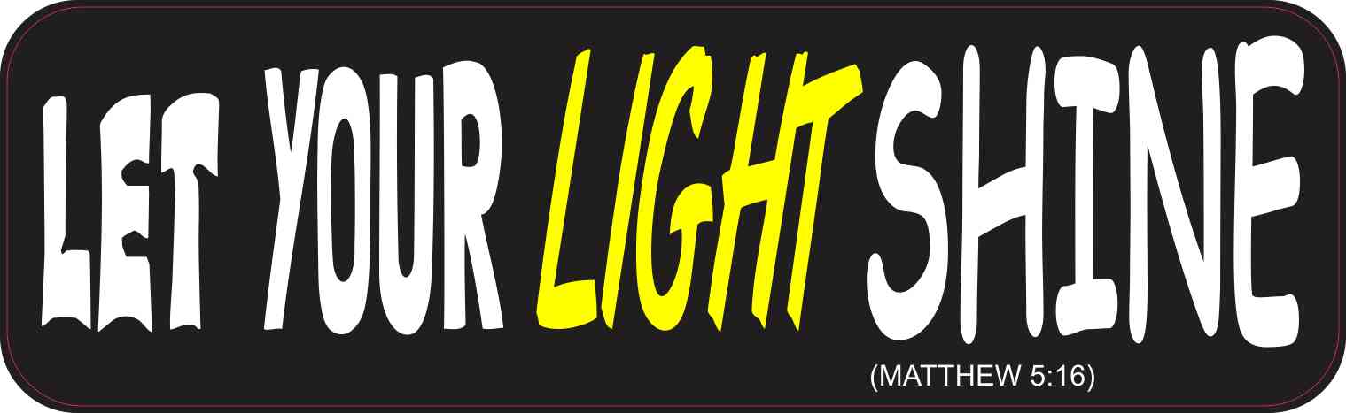 This bumper sticker is 10 inches wide by 3 inches tall when applied. It features the words, LET YOUR LIGHT SHINE; the word, LIGHT, is printed in florescent yellow letters, and the remainder of the text is printed in white. The verse location, (MATTHEW 5:16), is printed below in white letters. The sticker’s background is black. This carefully crafted product is a great way to share your faith!