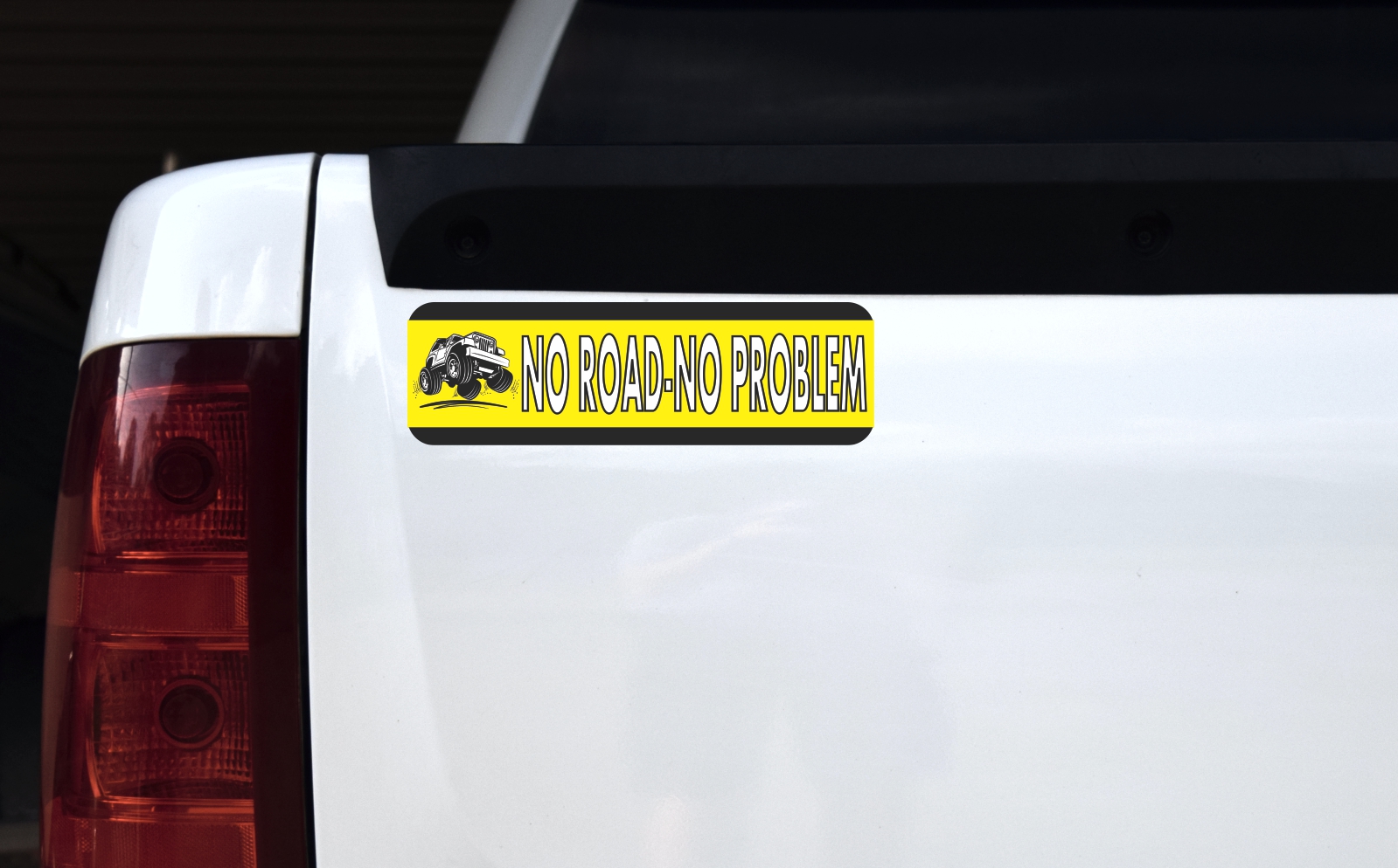 This magnet is 10 inches wide by 3 inches tall when applied.  It features the words, NO ROAD – NO PROBLEM, in white letters with black outlining on a yellow background.  A black and white picture of an off-road vehicle is printed on the left side of the text, and the top and bottom edges of the magnet are accented with a black border.  This carefully crafted product is the perfect novelty for any avid off-roader!  However, it only attracts ferromagnetic metals.