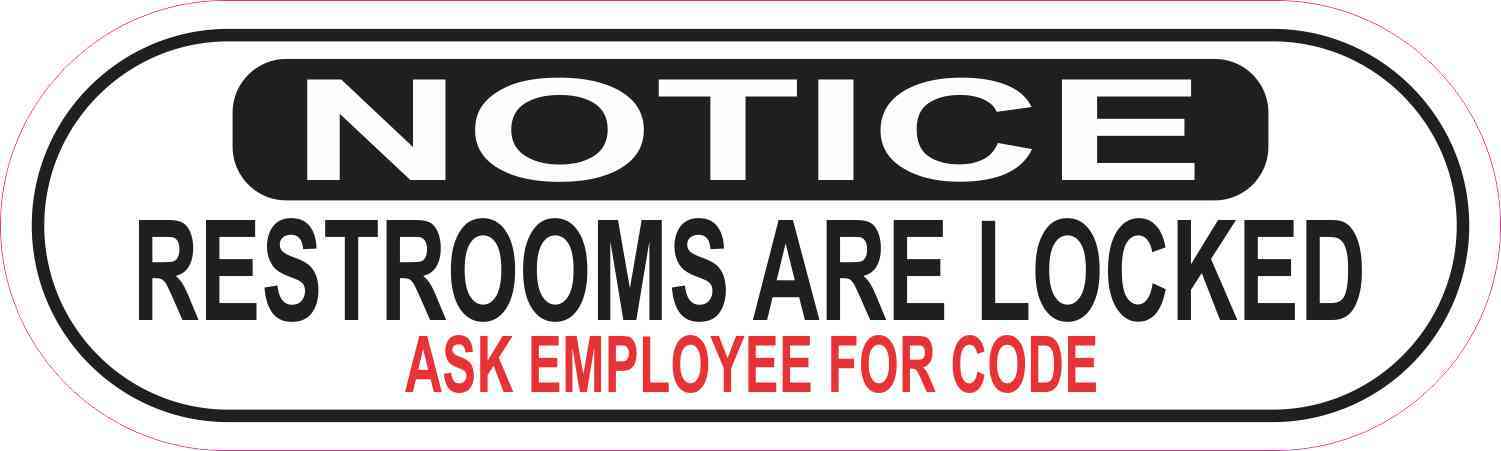 This oblong sticker is 10 inches wide by 3 inches tall when applied.  The word, NOTICE, appears at the top of the sticker in white letters on a black rectangle.  Under this, the words, RESTROOMS ARE LOCKED, are printed in black letters, and the words, ASK EMPLOYEE FOR CODE, are printed in red letters. The sticker’s background is white with a black border.  The pink line in the image shows where the sticker is cut; however, the pink line is not printed on the sticker.  This quality-made product is durable and easily visible, making it ideal for display almost any place of business!