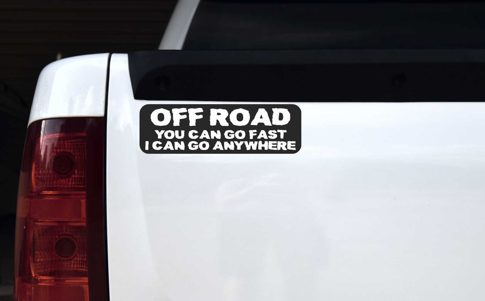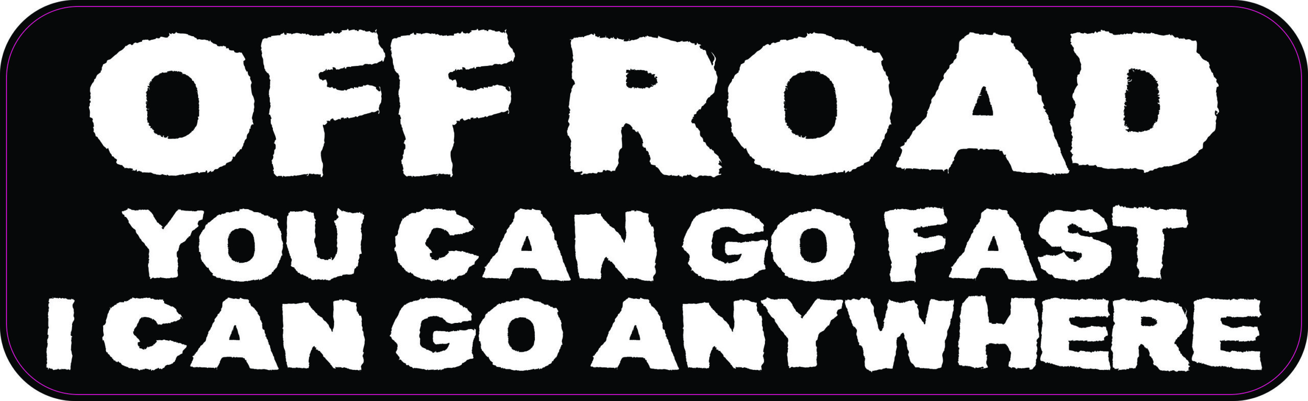 This magnet is 10 inches wide by 3 inches tall when applied. It features the words, OFF ROAD YOU CAN GO FAST I CAN GO ANYWHERE, in white letters on a black background. This carefully crafted product is a witty way to showcase your love for off roading! However, it only attracts ferromagnetic metals.