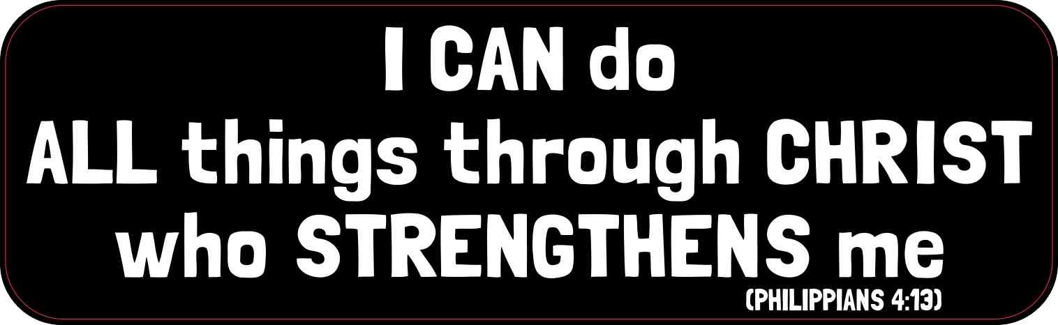 This bumper sticker is 10 inches wide by 3 inches tall when applied. It features the Bible verse, I CAN do ALL things through CHRIST who STRENGTHENS me (PHILIPPIANS 4:13), in white letters on a black background. This carefully crafted product is a great way to share your faith!