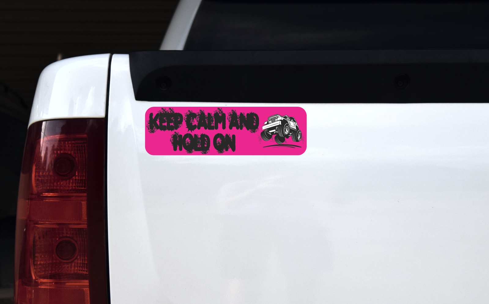 This bumper magnet is 10 inches wide by 3 inches tall when applied. It features the words, KEEP CALM AND HOLD ON, in black, messy letters on a pink background. A black and white picture of an off-road vehicle is printed on the right side of the text. This carefully crafted product is the perfect novelty for any avid off-roader! However, it only attracts ferromagnetic metals.