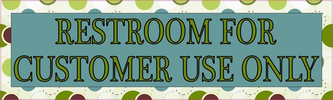 This magnet is 10 inches wide by 3 inches tall when applied. It features the words, RESTROOM FOR CUSTOMER USE ONLY, in green letters with black outlining on a teal background. The magnet’s cream-colored border is decorated with white, teal, green, and brown polka dots. The pink line in the image shows where the magnet is cut; the pink line is not printed on the magnet. This quality-made product is durable and easily visible, making it a great addition to nearly any place of business. However, it only attracts ferromagnetic metals.
