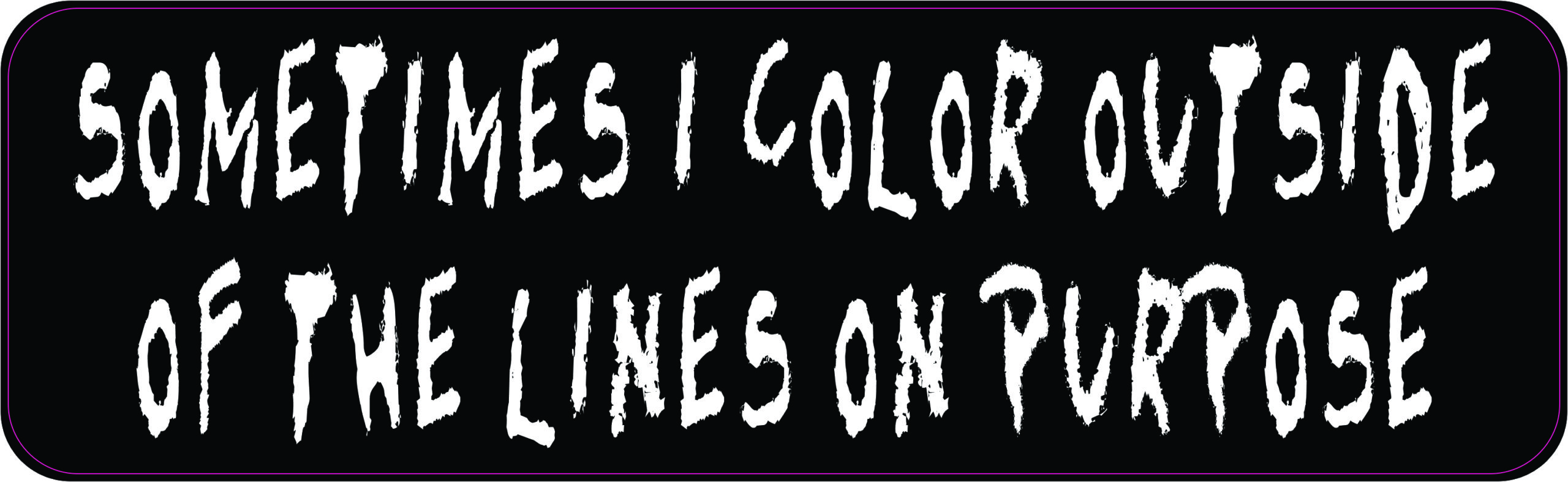 This sticker is 10 inches wide by 3 inches tall when applied.  It features the words, SOMETIMES I COLOR OUTSIDE OF THE LINES ON PURPOSE, in white letters on a black background.  This carefully crafted product is a witty way to add a splash of personality your vehicle!  However, it only attracts ferromagnetic metals.