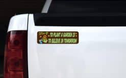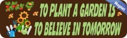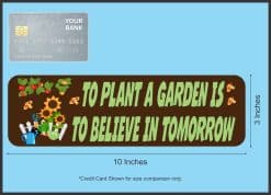 This bumper magnet is 10 inches wide by 3 inches tall when applied and has the words TO PLANT A GARDEN IS TO BELIEVE IN TOMORROW in green letters, outlined in black, on a brown background. A blooming garden appears to the left of the text, and a couple of birds flutter to the right of the text. This magnet is an essential accessory for any serious gardener!
