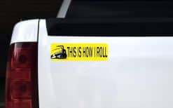 This bumper magnet is 10 inches wide by 3 inches tall when applied.  It features the words, THIS IS HOW I ROLL, in black letters with white outlining on a yellow background.  A black and white picture of a train is printed on the left side of the text.  This carefully-crafted product is a great way to showcase your love for trains!  However, it only attracts ferromagnetic metals.