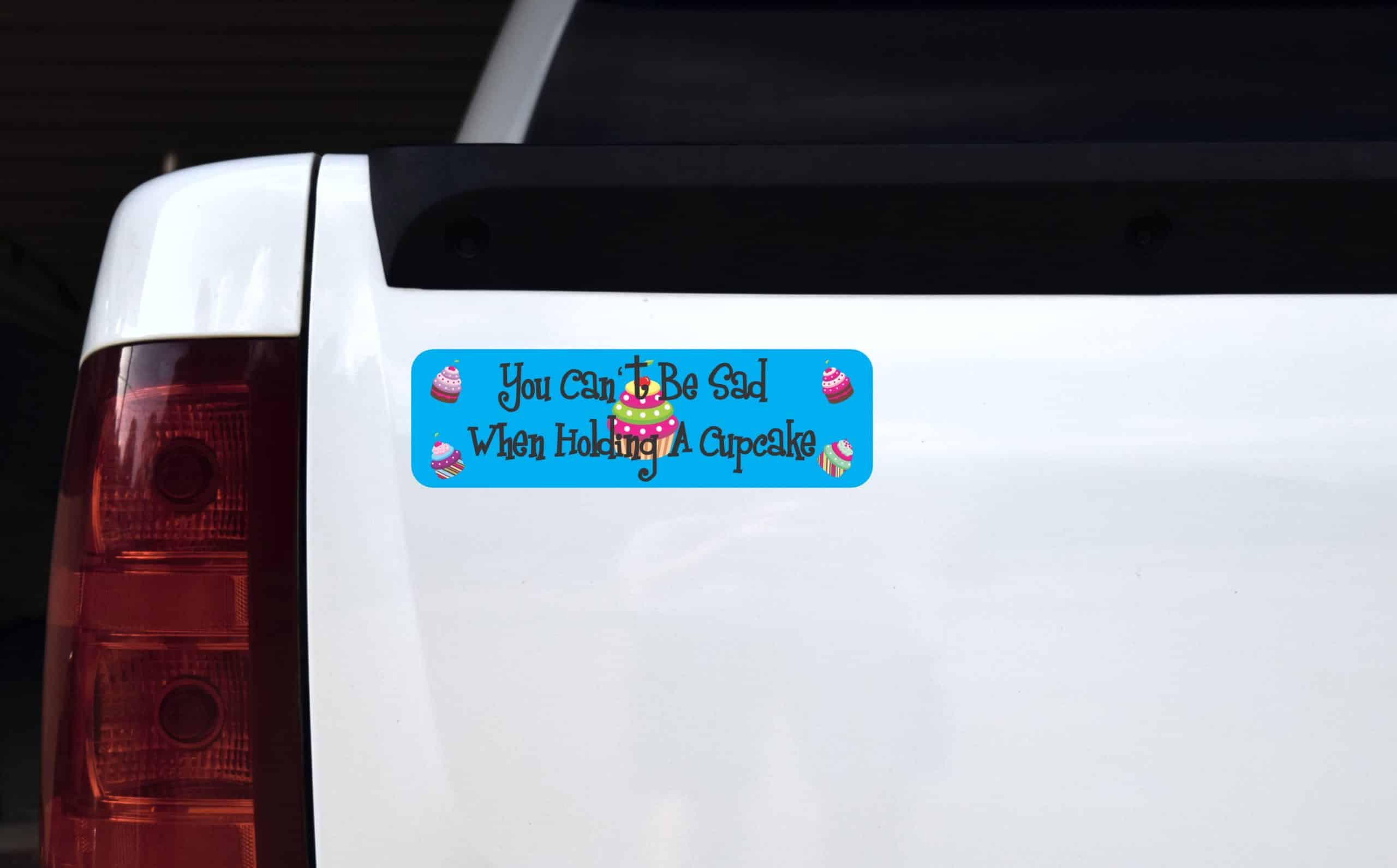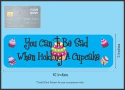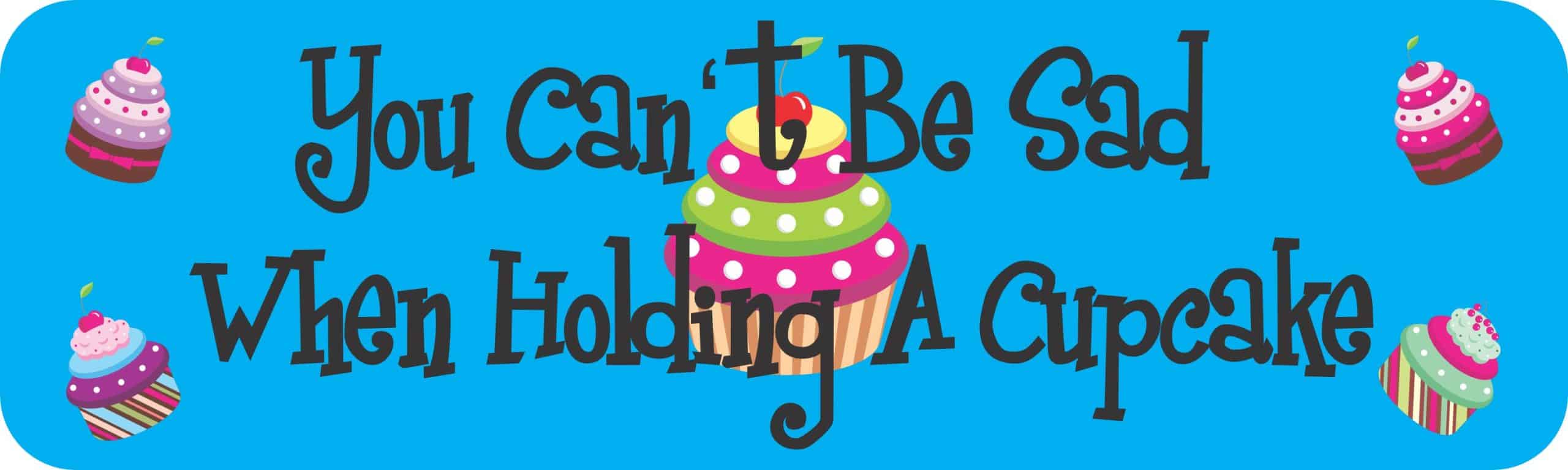 This magnet is 10 inches wide by 3 inches tall when applied.  It features the words, You Can’t Be Sad When Holding A Cupcake, in black letters on a blue background.  Colorful images of various sweet treats surround the text.  This carefully crafted product is a humorous way to add a splash of personality to your vehicle!  However, it only attracts ferromagnetic metals.