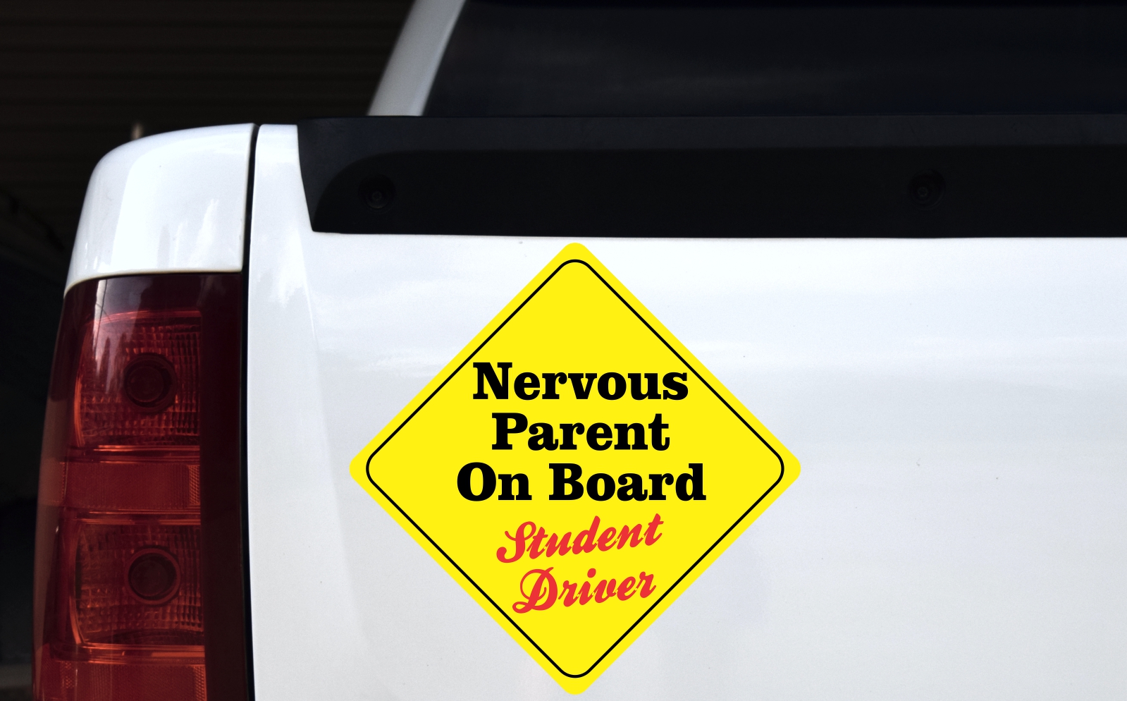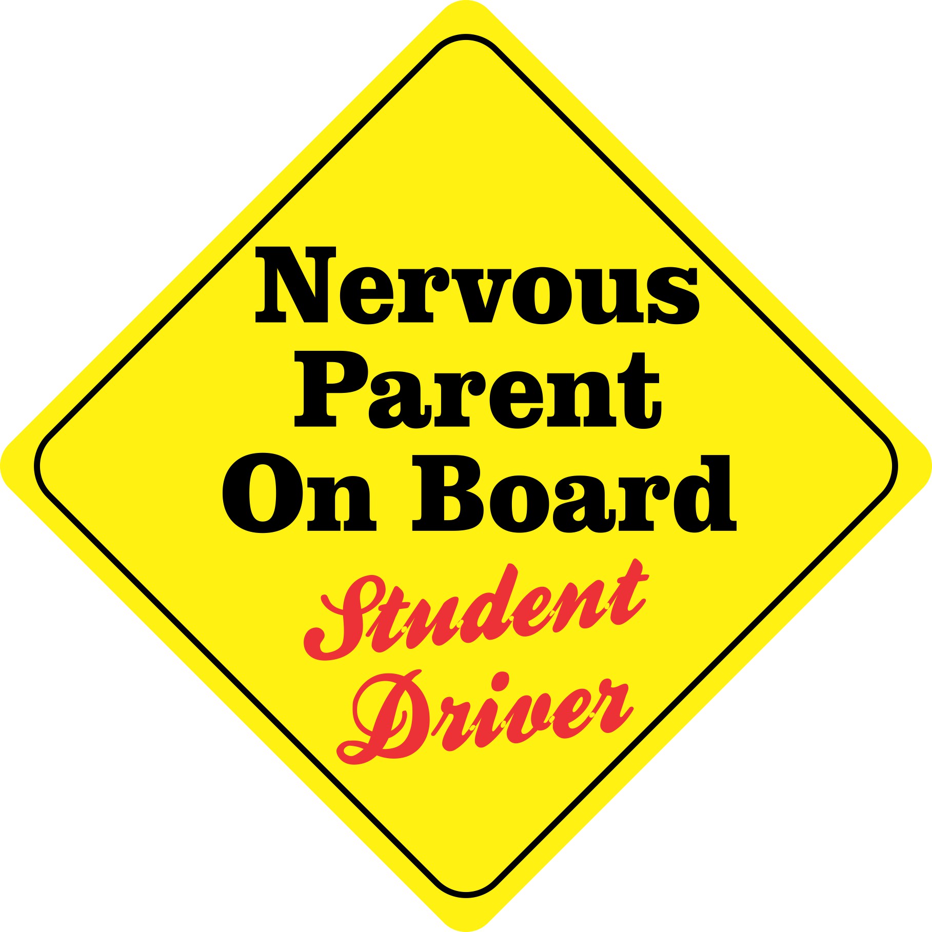 This magnet is 12 inches wide by 12 inches tall when applied. It features the words, Nervous Parent On Board, near the middle of the magnet in black letters and the phrase, Student Driver, below in red, cursive letters. The background is yellow, and a black border decorates the edges of the magnet. This quality-made product is a witty way to catch the attention of other drivers! However, it only attracts ferromagnetic metals.