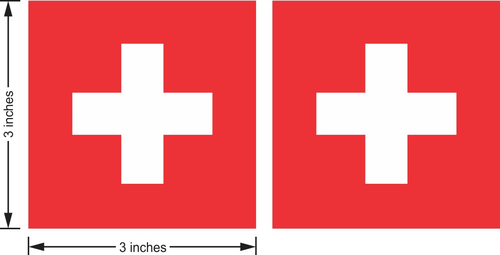 This is a pack of 2 stickers. Each sticker is 3 inches wide by 3 inches tall when applied. They depict the Swiss flag. This carefully crafted product is the perfect novelty for both locals and visitors to Switzerland! It can be proudly displayed on luggage, vehicles, cups and tumblers, and other hard, flat surfaces.
