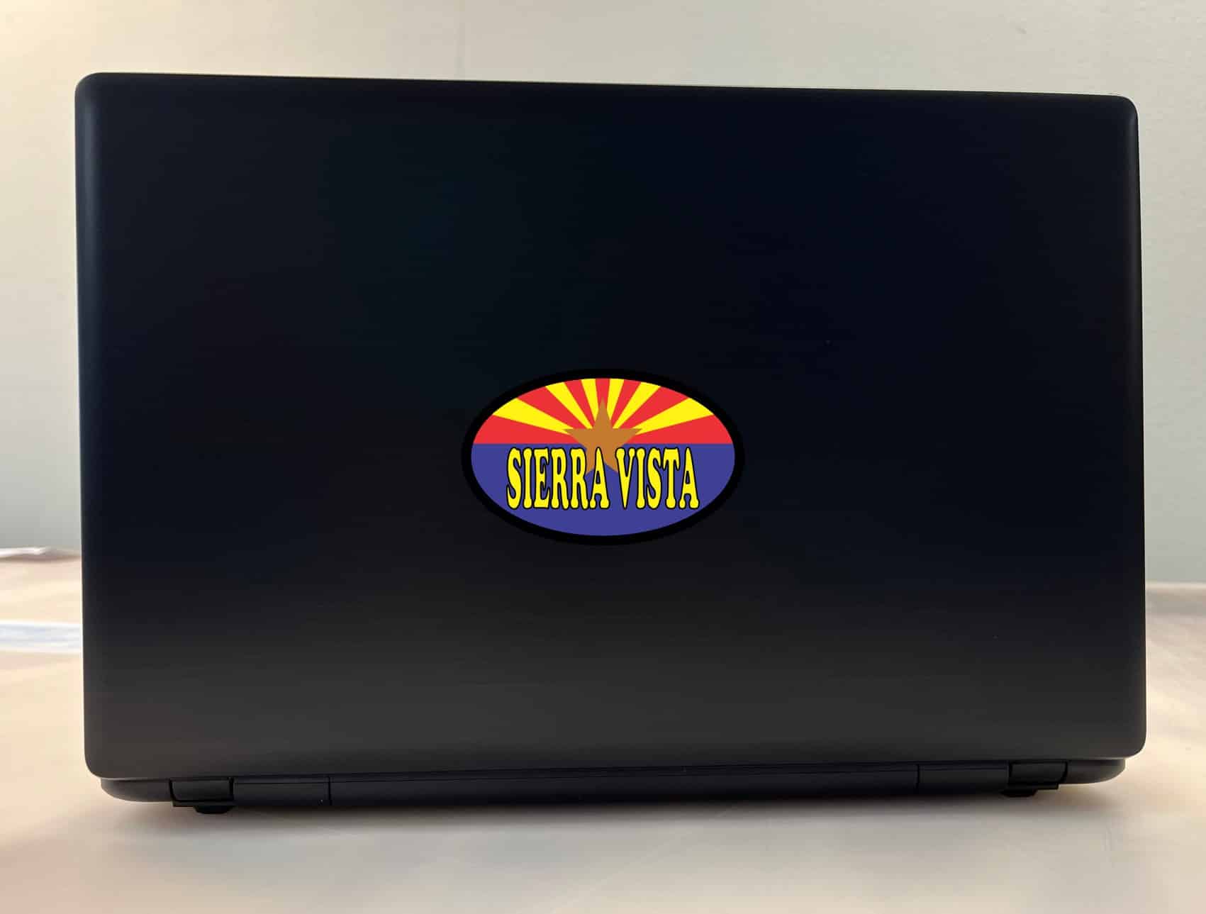 This oval-shaped sticker is approximately 4 inches wide by 2.5 inches tall when applied. It features the name, SIERRA VISTA, in yellow letters with black outlining. The sticker’s background is decorated with the state flag of Arizona, and a black border is printed on the edges of the sticker. This quality-made product is the perfect novelty for both locals and visitors to this scenic town! It can be proudly displayed on luggage, vehicles, cups and tumblers, and other hard, flat surfaces.