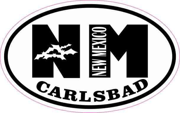 This oval-shaped sticker is 4 inches wide by 2.5 inches tall when applied and has a white background.  The state abbreviation, NM, is printed in the center of the sticker in black letters.  White silhouettes of bats are printed inside the N, and the state name, NEW MEXICO, is printed in white letters inside the M.  The city name, CARLSBAD, is printed below in black letters that curve to compliment the sticker’s black border.  The pink line in the image shows where the sticker is cut; the pink line is not printed on the sticker.  This quality-made product is the perfect novelty for both locals and visitors to this enchanting city!  It can be proudly displayed on luggage, vehicles, cups and tumblers, tablets, and other flat, hard surfaces.