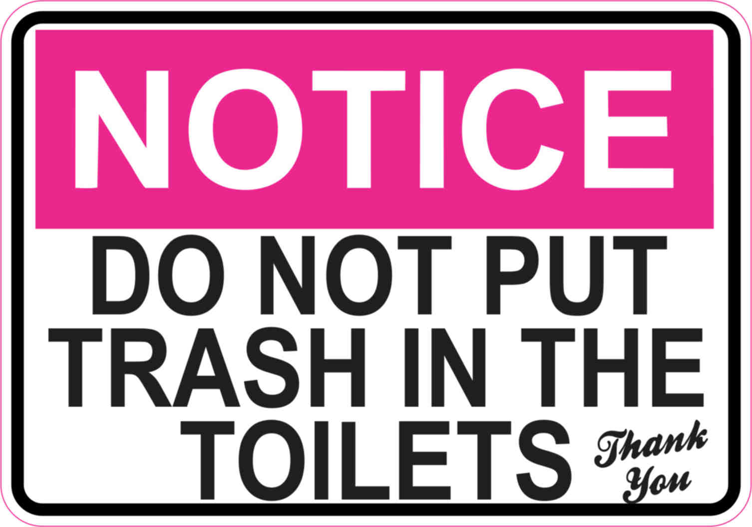 This sticker is 5 inches wide by 3.5 inches tall when applied. The sticker has the word, NOTICE, in white letters on a pink background; underneath, the words, DO NOT PUT TRASH IN THE TOILETS, appear in black letters on a white background. A black line runs just inside the edges of the sticker, and the words, Thank You, appear in black, cursive letters.