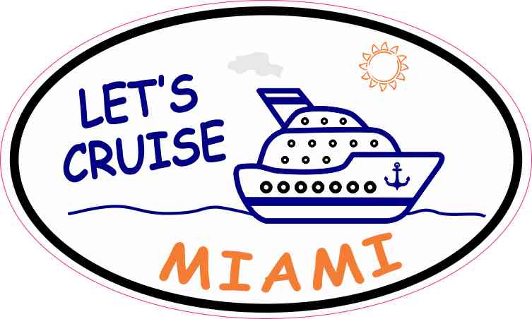 This oval-shaped sticker is 5 inches wide by 3 inches tall when applied and has a white background. It contains a sketch of a blue cruise ship atop blue waves under an orange sun. The words, LET’S CRUISE, are printed in blue letters on the left side of the cruise ship, and the name, MIAMI, is printed below the image in orange letters that curve to complement the sticker’s black border. The pink line in the image shows where the sticker is cut; however, the pink line is not printed on the sticker. This quality-made product is the perfect novelty for cruisers! It can be proudly displayed on luggage, cruise ship cabin doors, cups and tumblers, tablets, and other flat, hard surfaces.