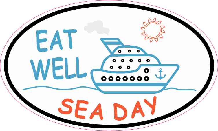 This oval-shaped sticker is 5 inches wide by 3 inches tall when applied and has a white background. It contains a sketch of a blue cruise ship atop blue waves under an orange sun. The words, EAT WELL, are printed in blue letters on the left side of the cruise ship, and the words, SEA DAY, are printed below the image in orange letters that curve to complement the sticker’s black border. The pink line in the image shows where the sticker is cut; however, the pink line is not printed on the sticker. This quality-made product is the perfect novelty for cruisers! It can be proudly displayed on luggage, cruise ship cabin doors, cups and tumblers, tablets, and other flat, hard surfaces.