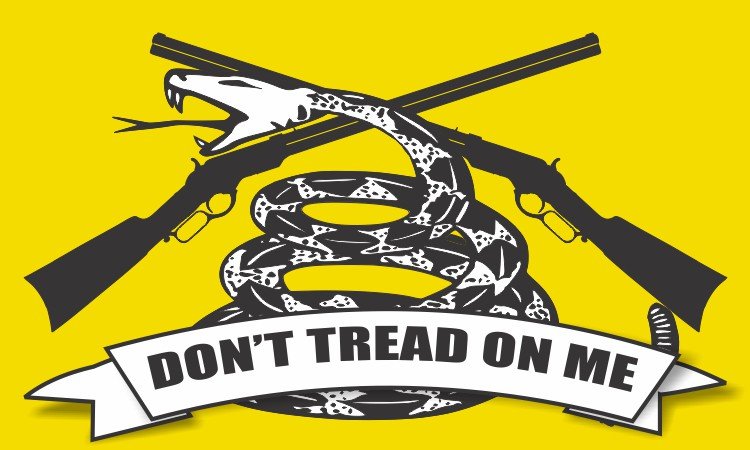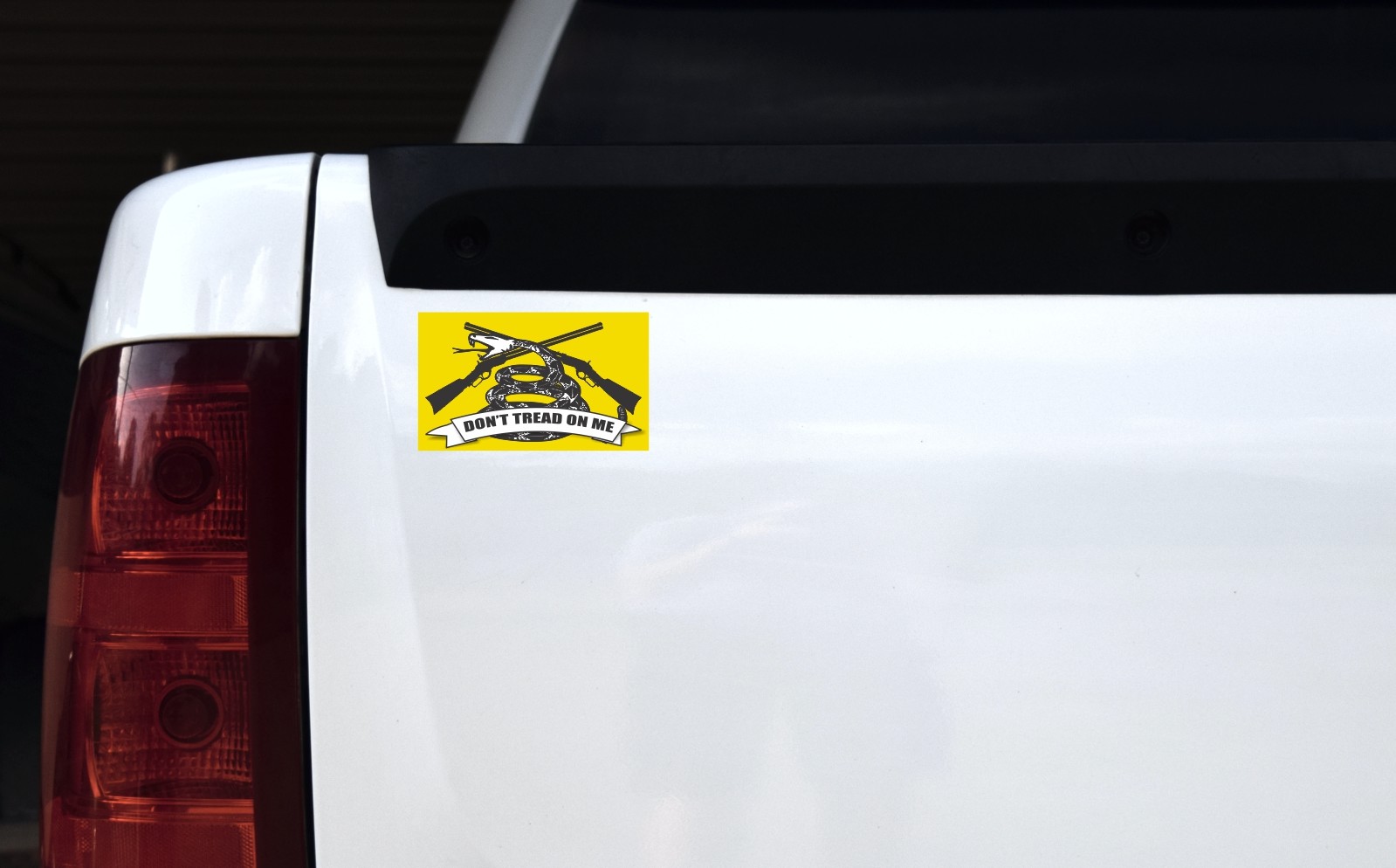 This magnet is 5 inches wide by 3 inches tall when applied. It depicts the Gadsden Flag with crossed rifles behind the coiled snake and towards the top of the design. The background is yellow, and there is a banner in front of the coiled snake that reads, DONT TREAD ON ME. This quality-made product is a great way to show off your political perspectives!