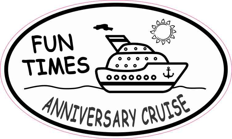 This oval-shaped sticker is 5 inches wide by 3 inches tall when applied and has a white background. It contains a black and white sketch of a cruise ship sailing under a beaming sun. The words, FUN TIMES, are printed in black letters on the left side of the cruise ship, and the words, ANNIVERSARY CRUISE, are printed below the image in black letters that curve to complement the sticker’s black border. The pink line in the image shows where the sticker is cut; however, the pink line is not printed on the sticker. This quality-made product is a great way to celebrate on the seas! It can be proudly displayed on luggage, cruise ship cabin doors, cups and tumblers, tablets, and other flat, hard surfaces.