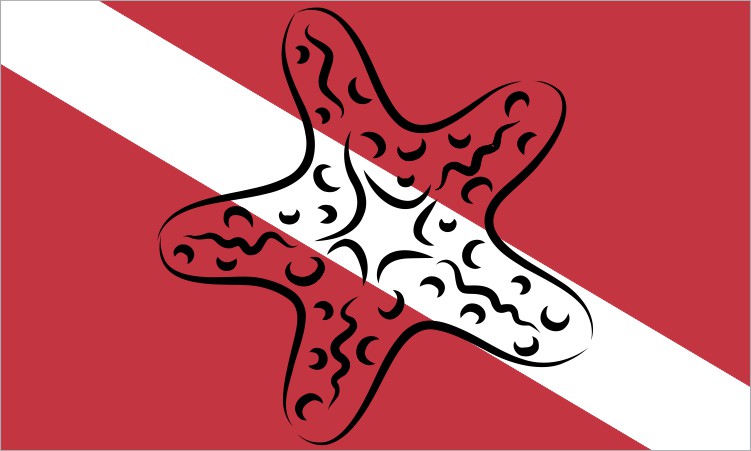 This magnet measures 5 inches wide by 3 inches tall in a rectangular shape. The design is that of the notable red Diver Down flag with the diagonal white stripe. However, this particular magnet has an outline of a starfish in the foreground of the magnet. This magnet is great for any diver; as a gift or just for yourself!