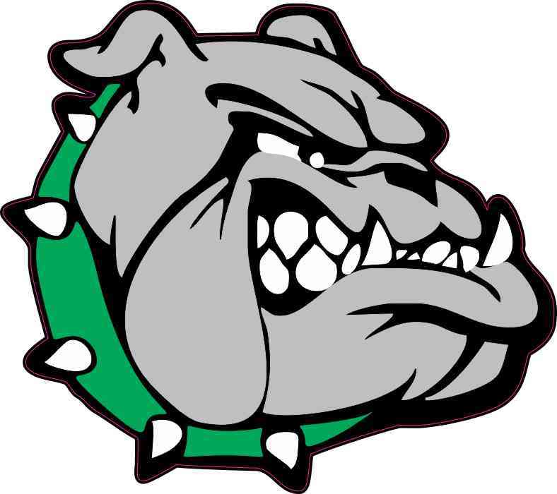 This sticker is 5 inches wide by 4.5 inches tall after application. It depicts a right-facing, gray bulldog sporting a spiked, green collar. The sticker is die cut, so no white background will remain once it is applied. This carefully crafted product is a terrific way to showcase your team spirit! It can be proudly displayed on vehicles, large cups and tumblers, tablets, and other flat, hard surfaces!