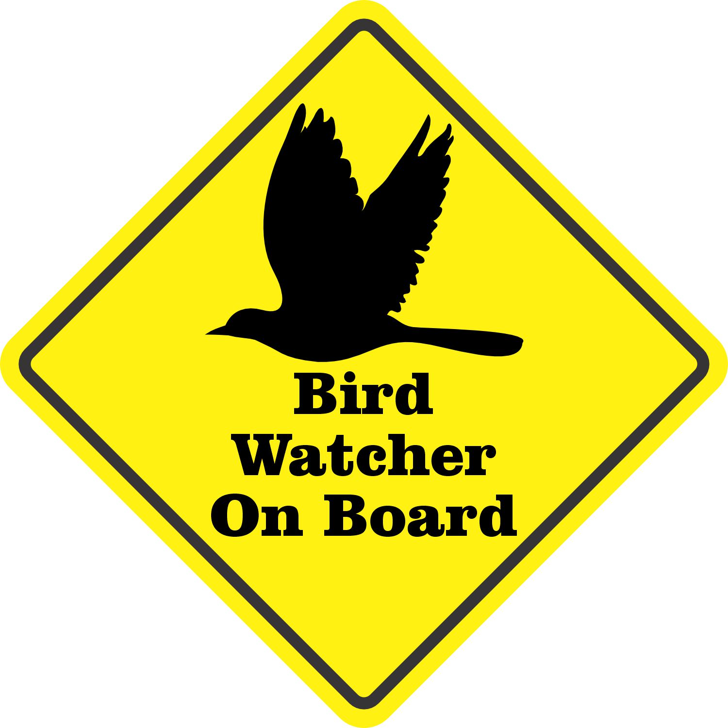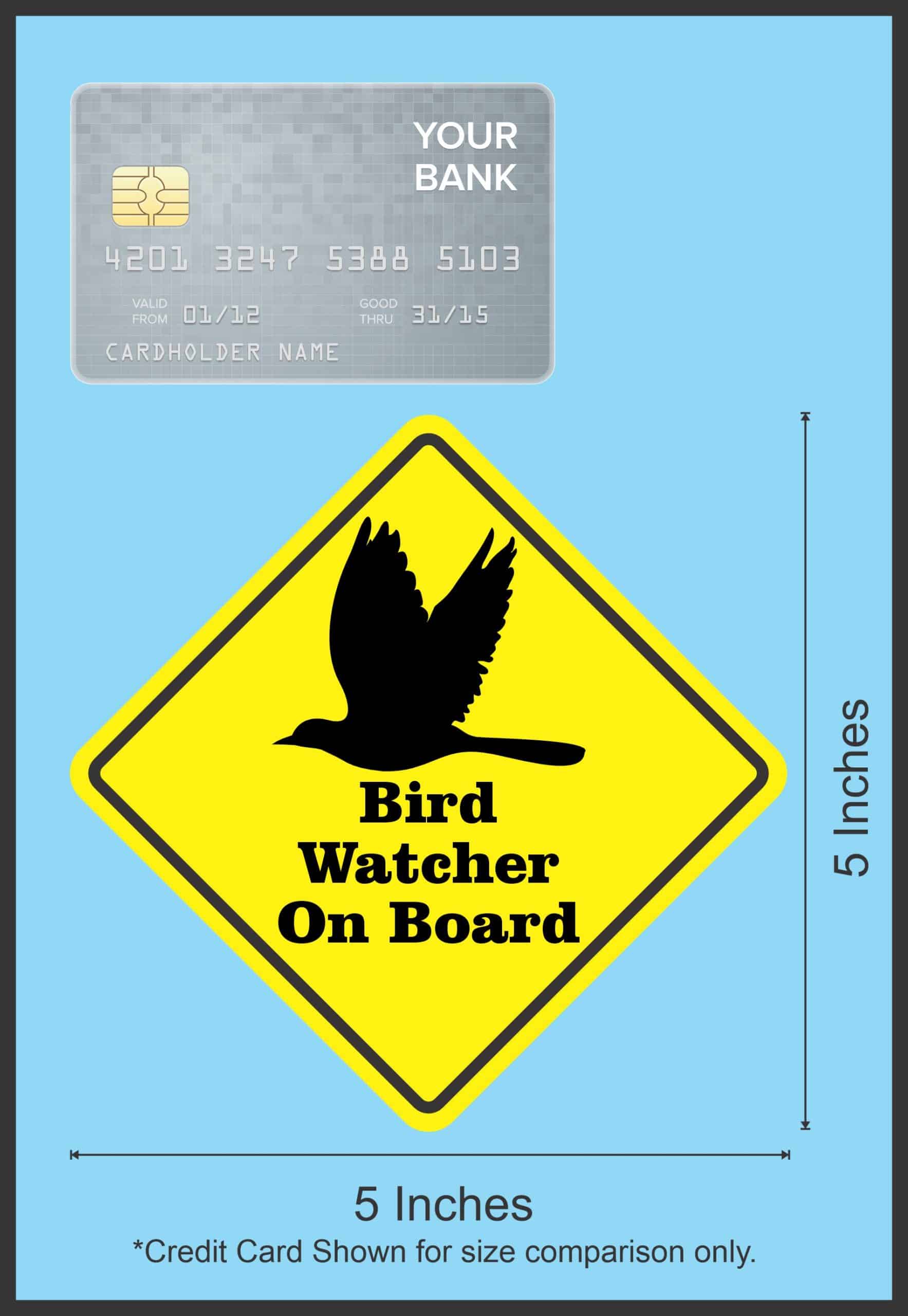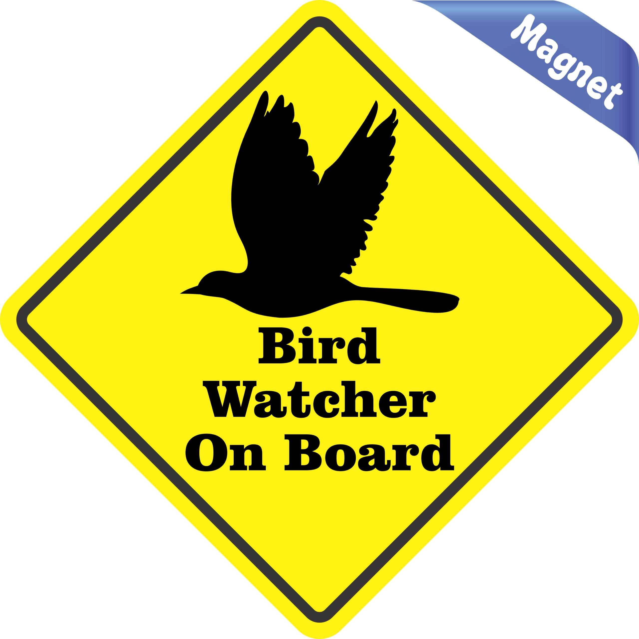 This magnet is 5 inches wide by 5 inches tall when applied. It features the words, Bird Watcher On Board, in black letters on a yellow background. A black border decorates the edges of the magnet, and a black silhouette of a bird is printed above the text. This carefully crafted vehicle accessory is a great way to share your love for bird watching! However, it only attracts ferromagnetic metals.