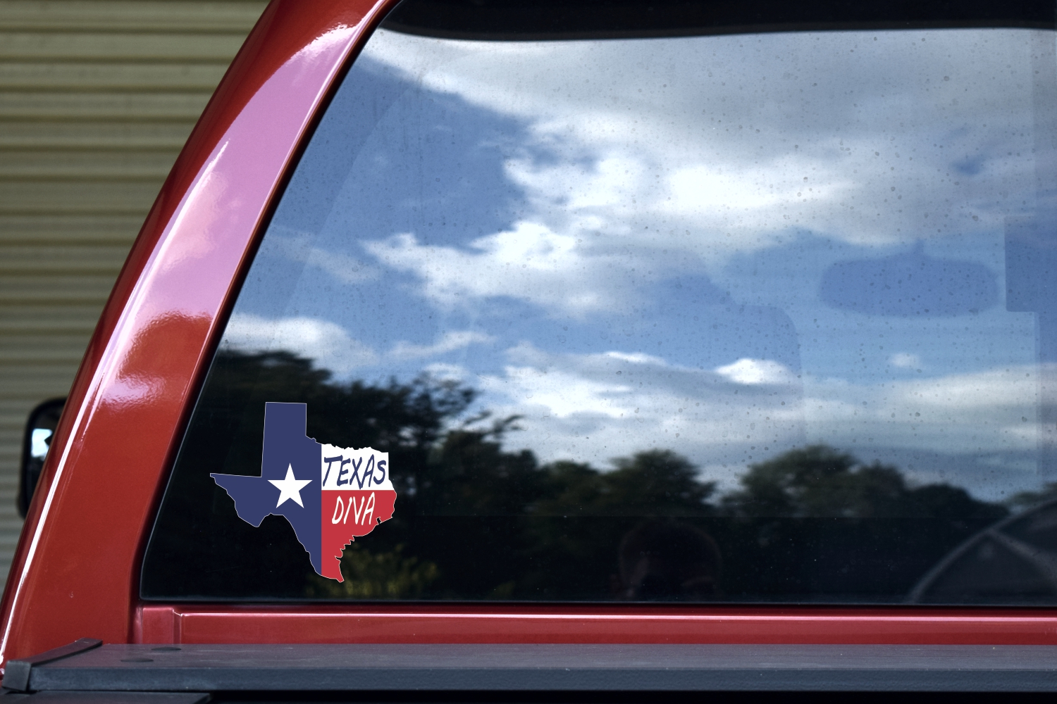 This sticker is 5 inches wide by 5 inches tall after application. It is die cut into the shape of Texas and decorated with the state flag of Texas. The word, TEXAS, is printed in blue letters in the white portion of the flag, and the word, DIVA, is printed in white letters on the red portion of the flag. The pink line in the image shows where the sticker is cut; the pink line is not printed on the sticker. This carefully crafted product is a great way to show off your Texas pride! It can be proudly displayed on vehicles, cups and tumblers, tablets, and other hard, flat surfaces.