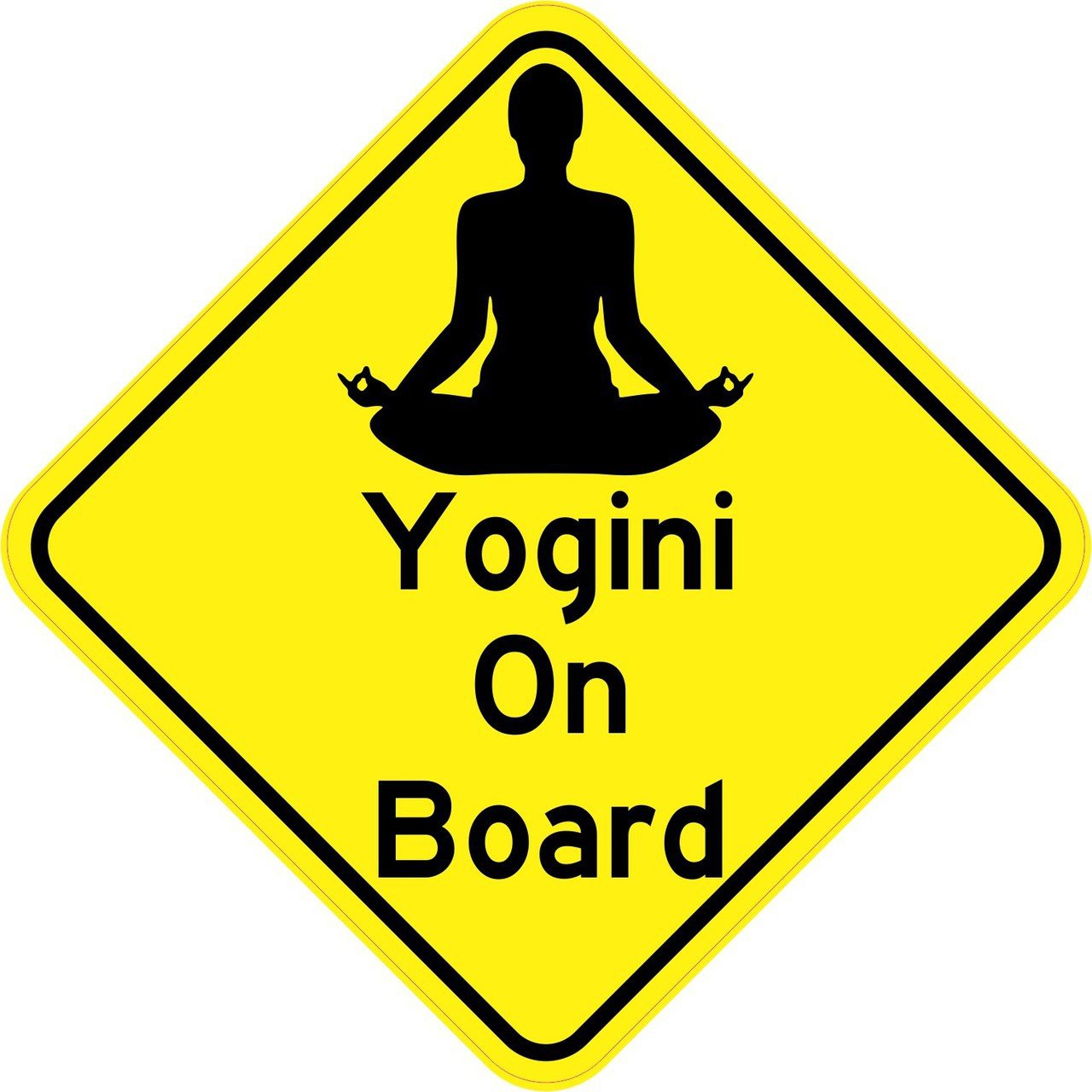 This sticker is 5 inches wide by 5 inches tall when applied. It features the words, Yogini On Board, in black letters on a yellow background. A black silhouette of a person meditating is printed above the text, and black border decorates the edges of the sticker. This carefully crafted vehicle accessory is a great way to share your love for yoga!