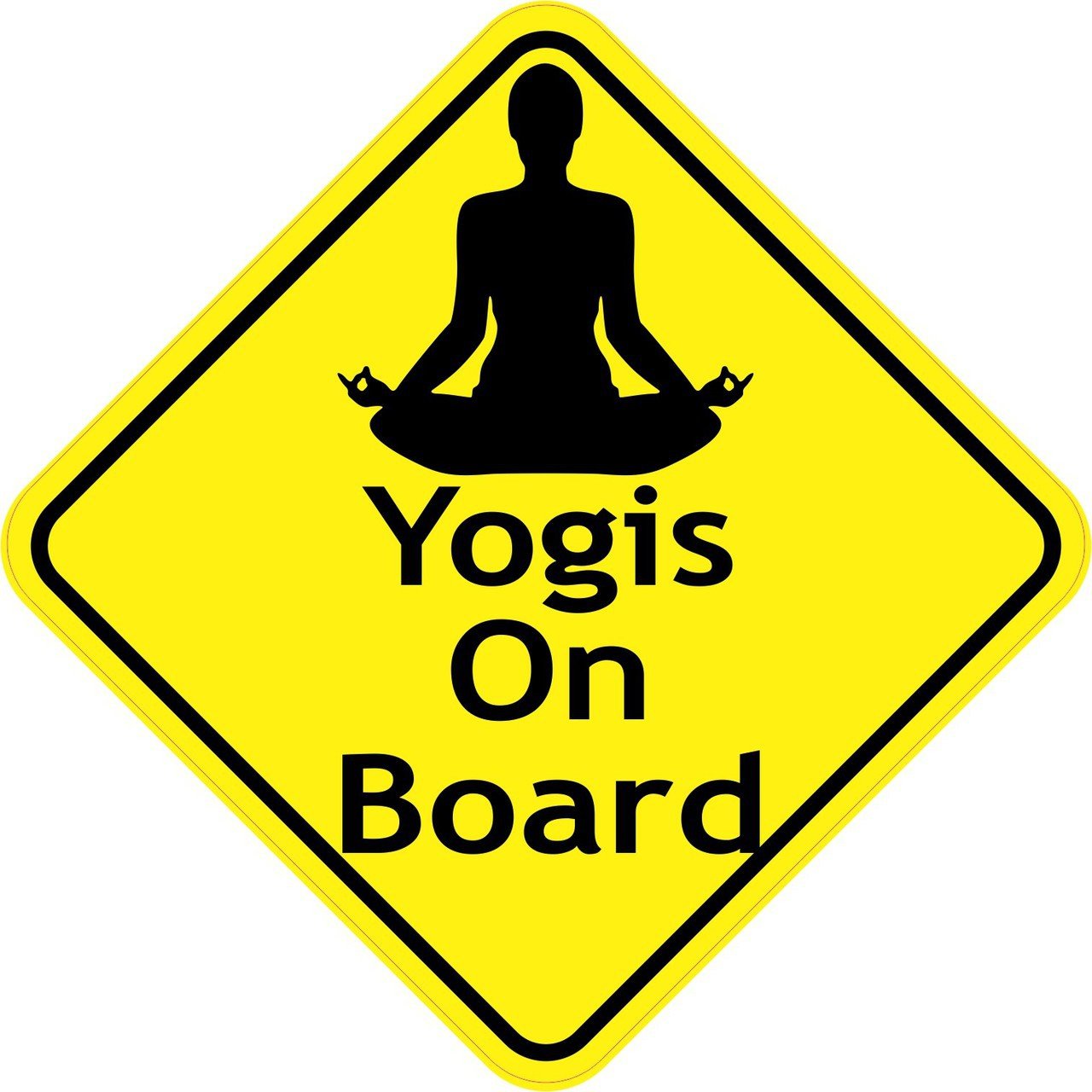 This sticker is 5 inches wide by 5 inches tall when applied. It features the words, Yogis On Board, in black letters on a yellow background. A black silhouette of a person meditating is printed above the text, and black border decorates the edges of the sticker. This carefully crafted vehicle accessory is a great way to share your love for yoga!