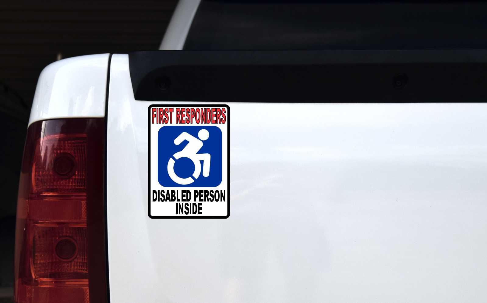 This sticker is 5 inches wide by 7 inches tall when applied. The words, FIRST RESPONDERS, are printed at the top of the sticker in red letters with black outlining. A white dynamic disability symbol is printed in the middle of the sticker on a blue square, and the words, DISABLED PERSON INSIDE, are printed below the symbol in black letters. The sticker’s background is white. A black border decorates the edges of the sticker. This quality-made product is durable and easily visible, making it an effective way to ensure the safety of the disabled.