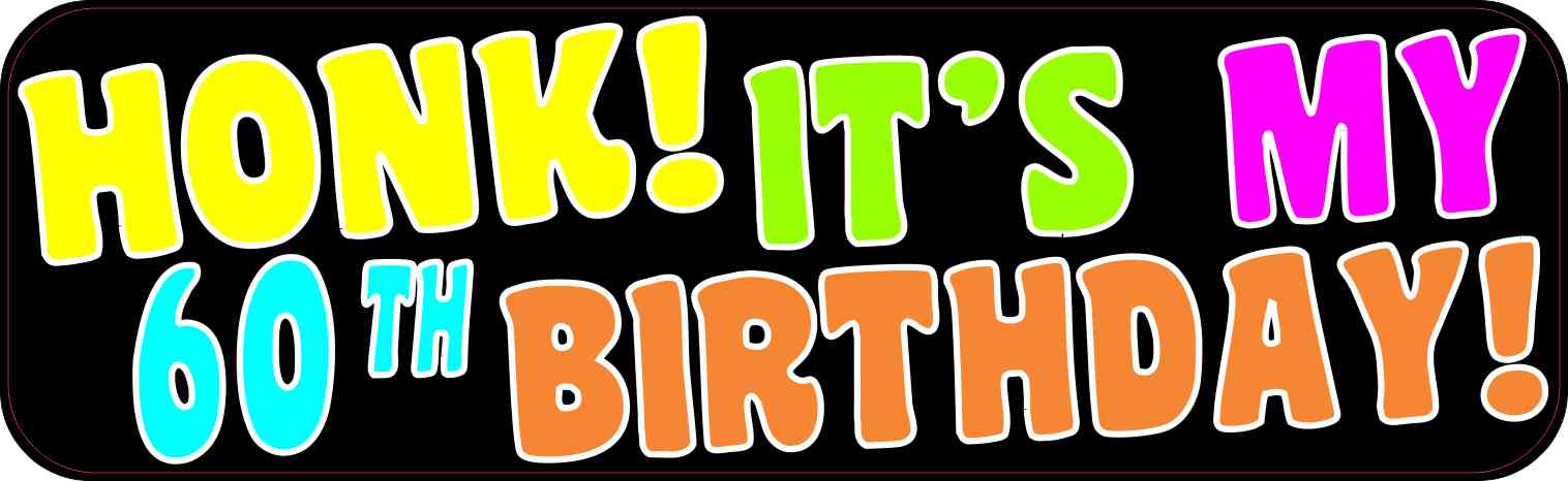 This bumper sticker is 10 inches wide by 3 inches tall when applied and has the words, HONK! IT’S MY 60th BIRTHDAY!, in yellow, green, purple, orange, and teal letters, all outlined in white, on a black background. This sticker is sure to garner smiles!